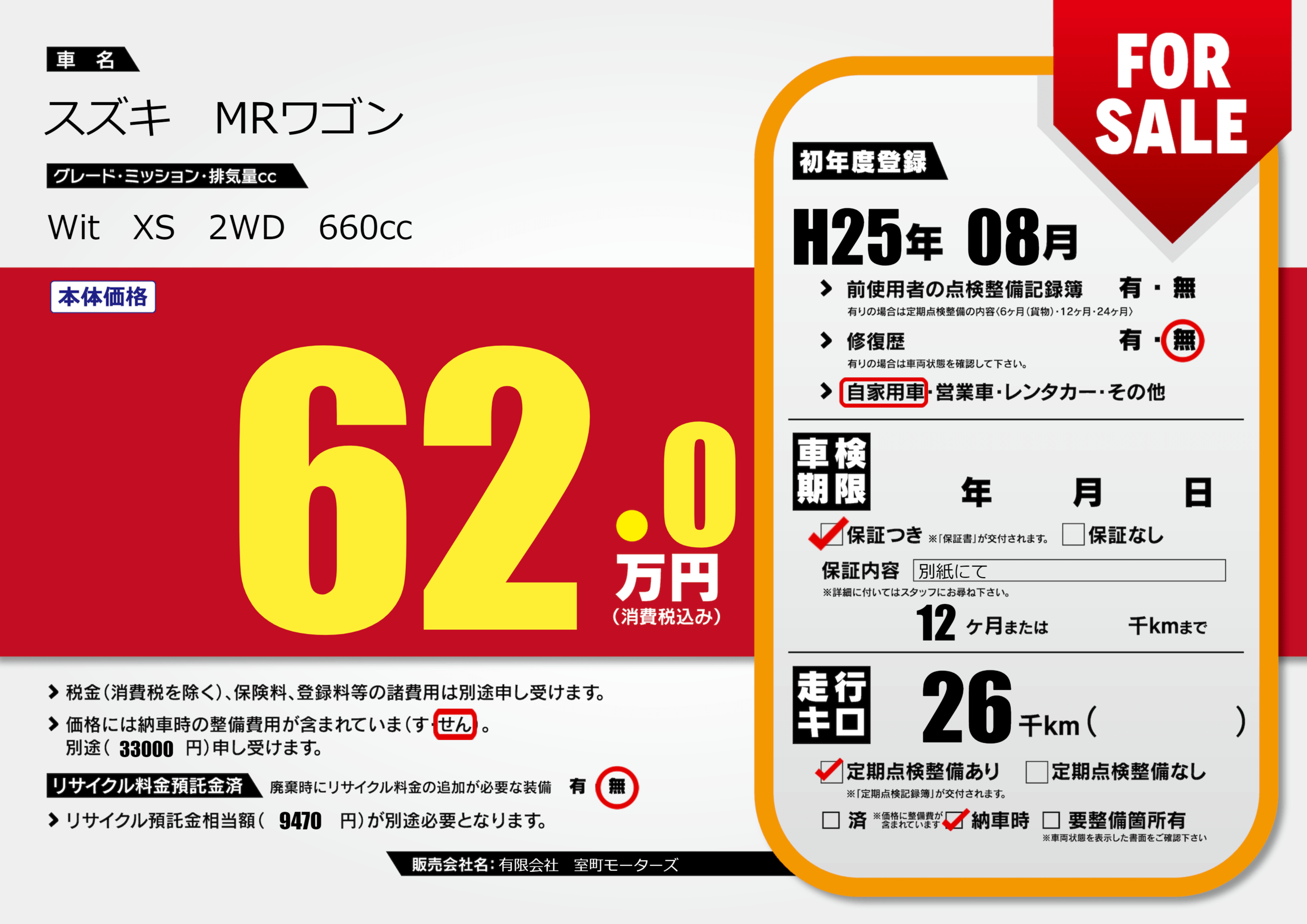| 車名 | スズキ MRワゴン | グレード ミッション 排気量 |