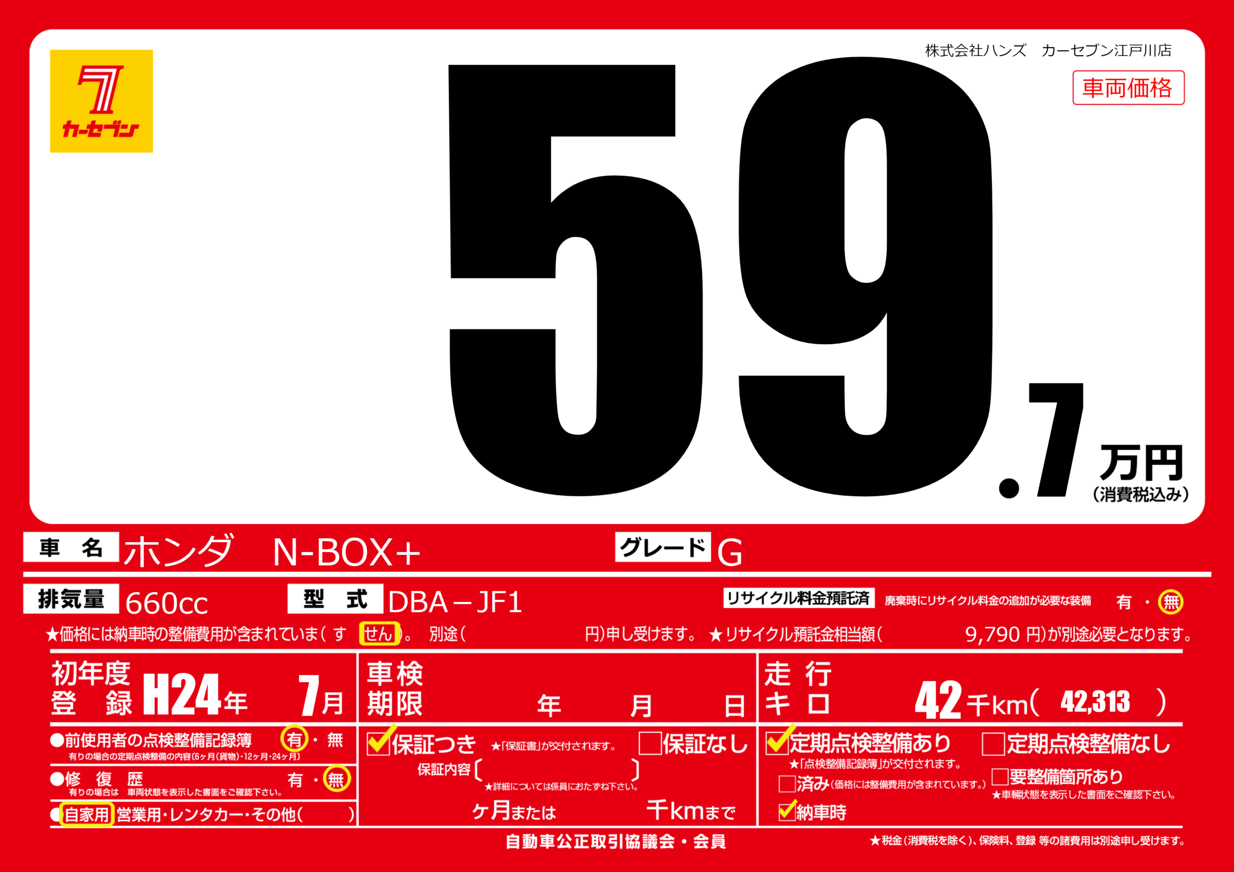 | 車名 | ホンダ N-BOX+ | グレード ミッション 排気量 |