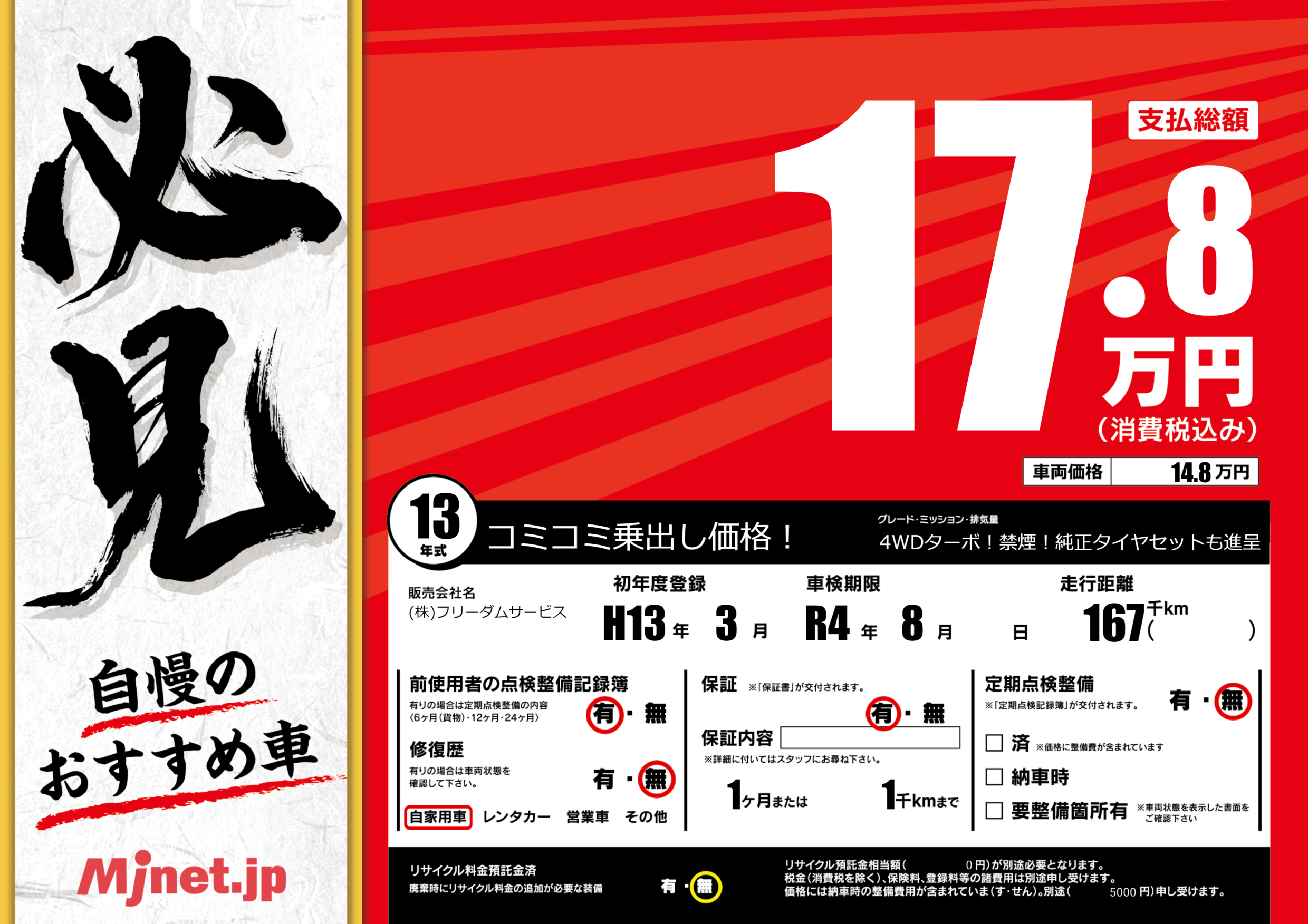 | 走行キロ | 16.7万km | 初年度登録 | H13年3月 |