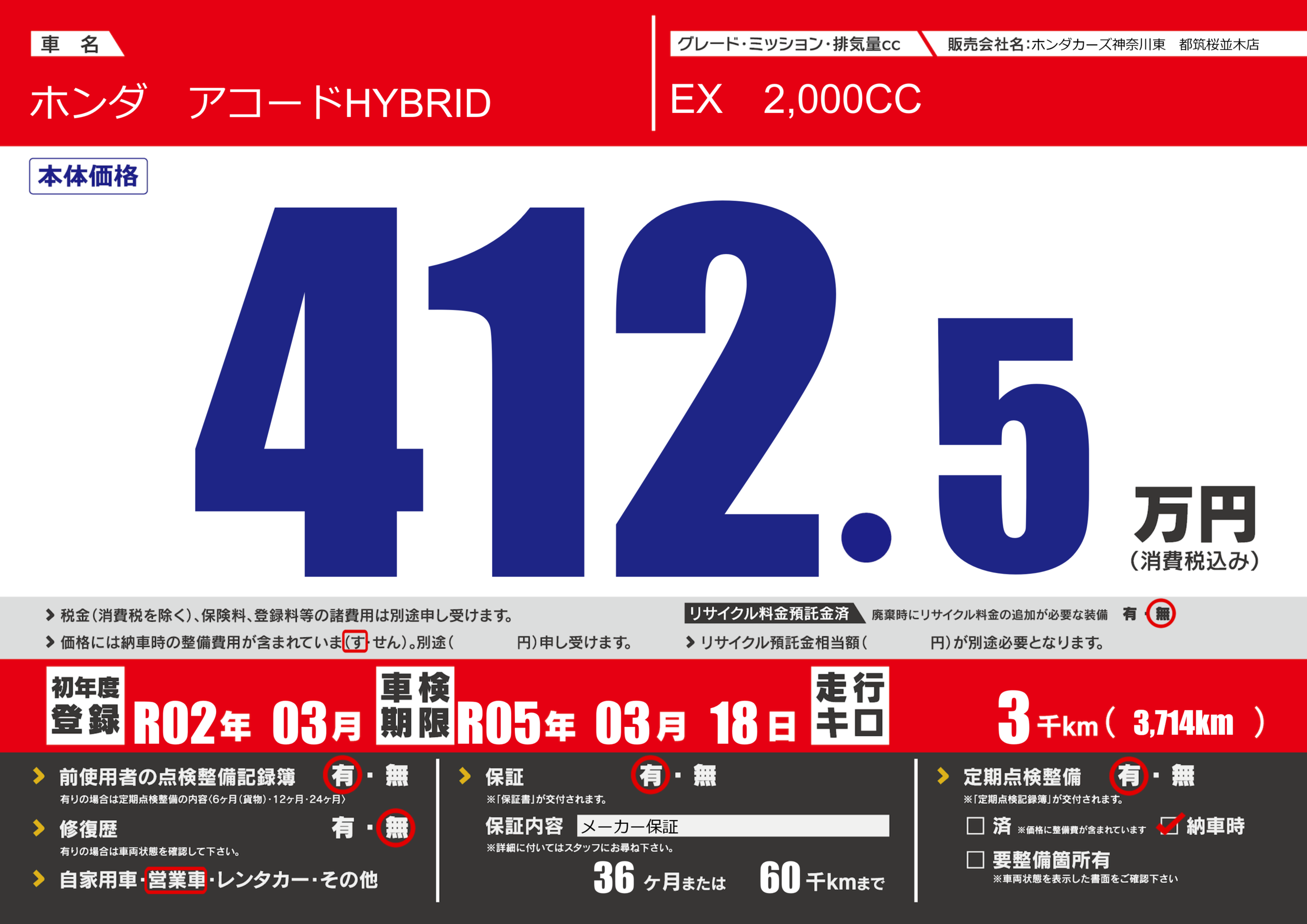 | 車名 | ホンダ アコードHYBRID | グレード ミッション 排気量 |