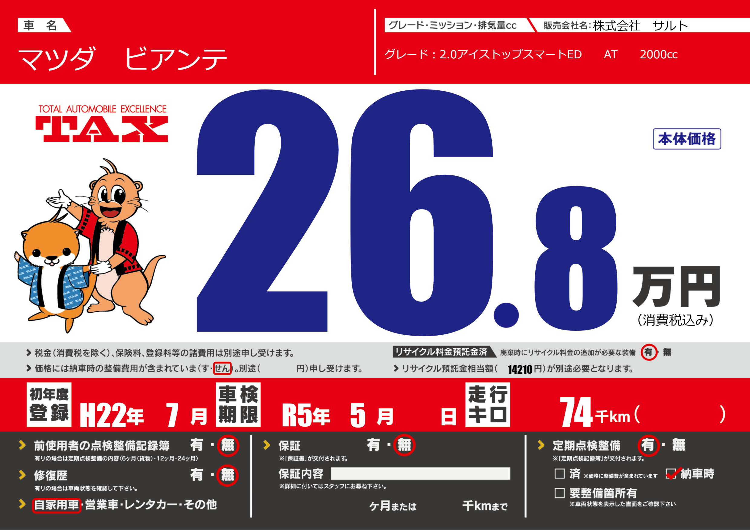 | 車名 | マツダ ビアンテ | グレード ミッション 排気量 |