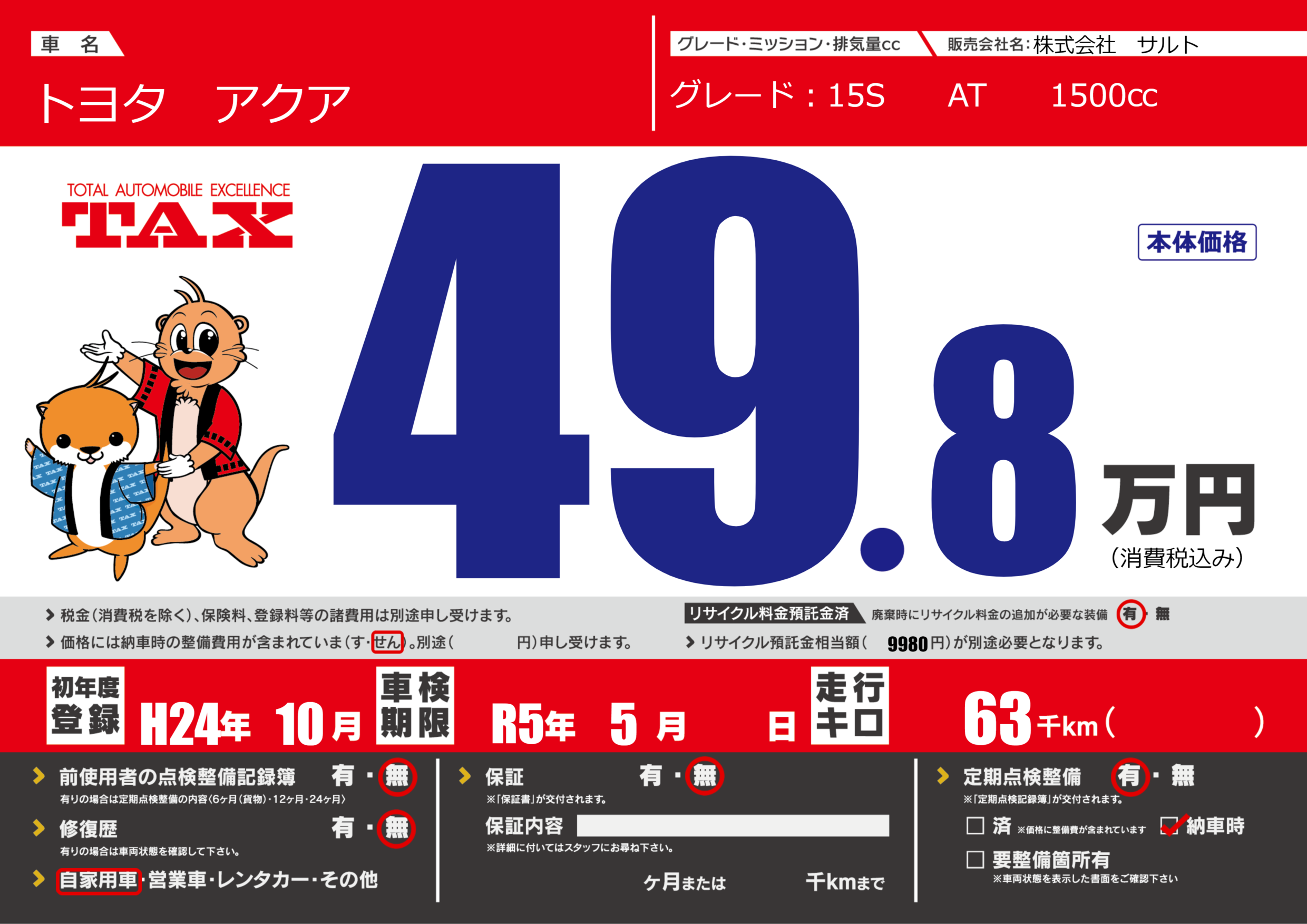 | 車名 | トヨタ アクア | グレード ミッション 排気量 |
