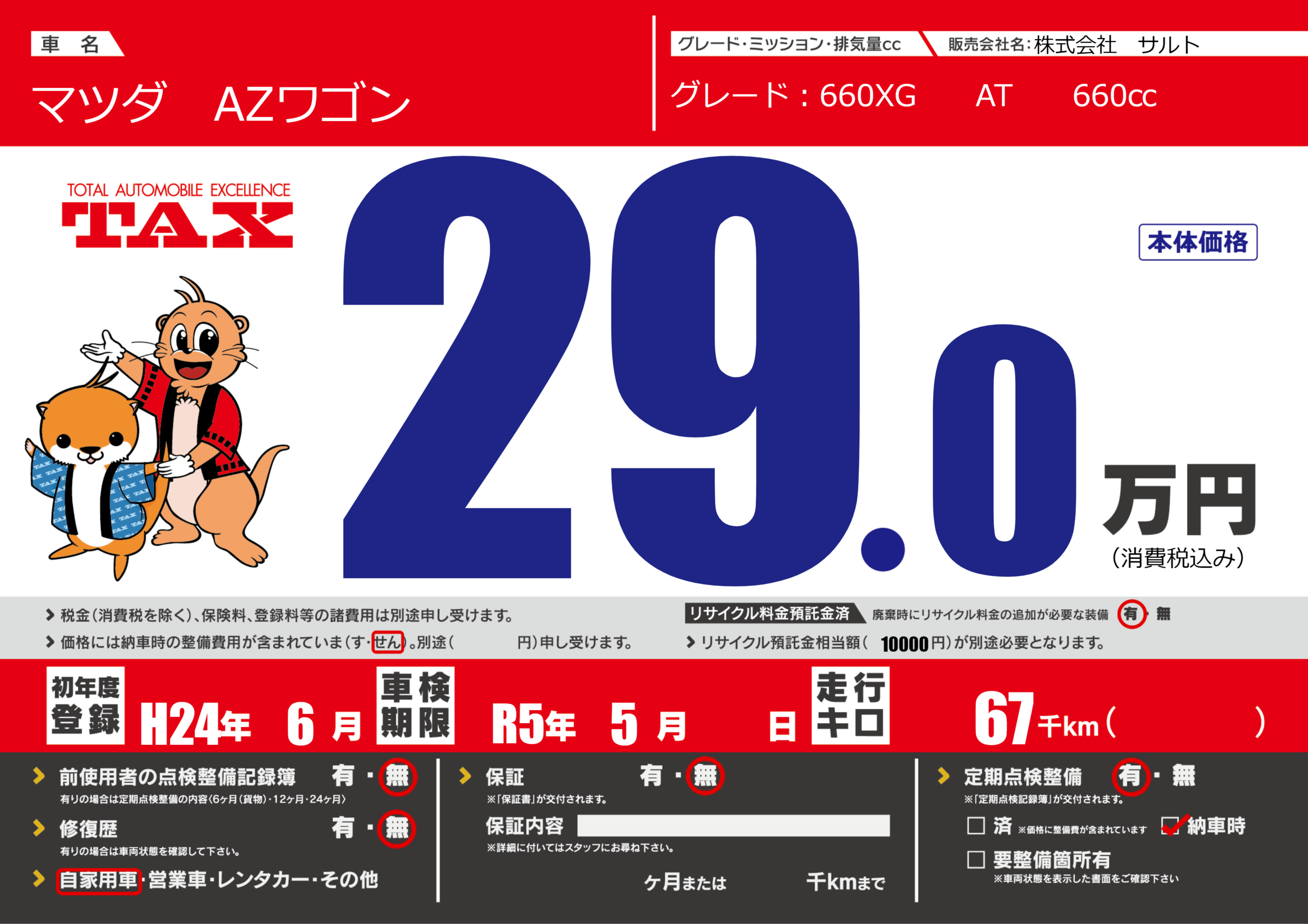| 車名 | マツダ AZワゴン | グレード ミッション 排気量 |