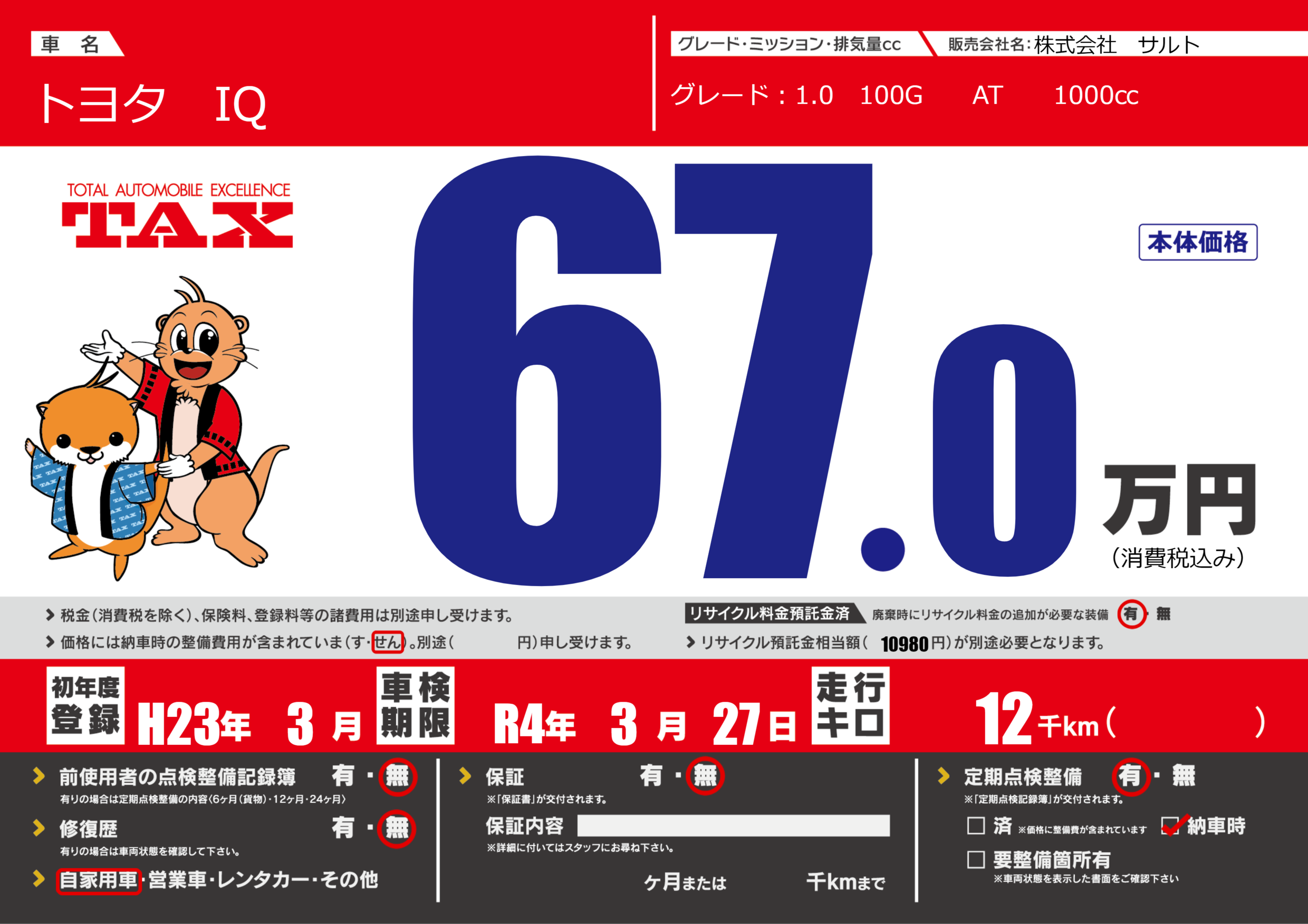 | 車名 | トヨタ IQ | グレード ミッション 排気量 |
