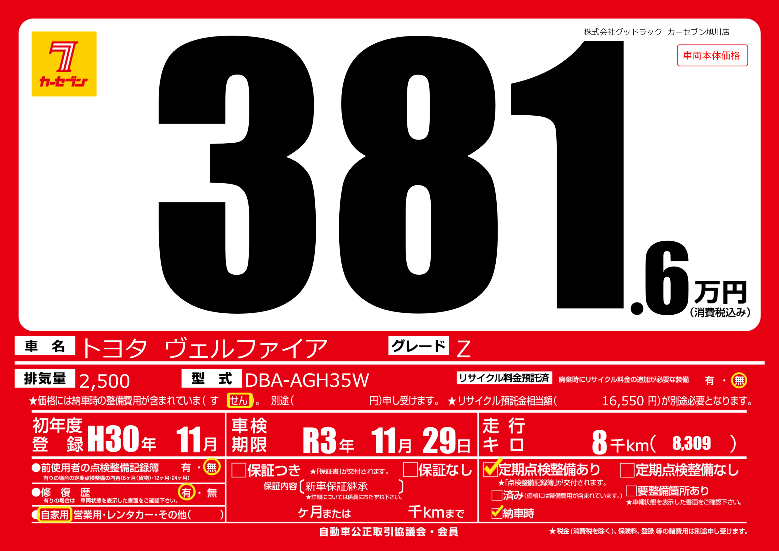 | 車名 | トヨタ ヴェルファイア | グレード ミッション 排気量 |