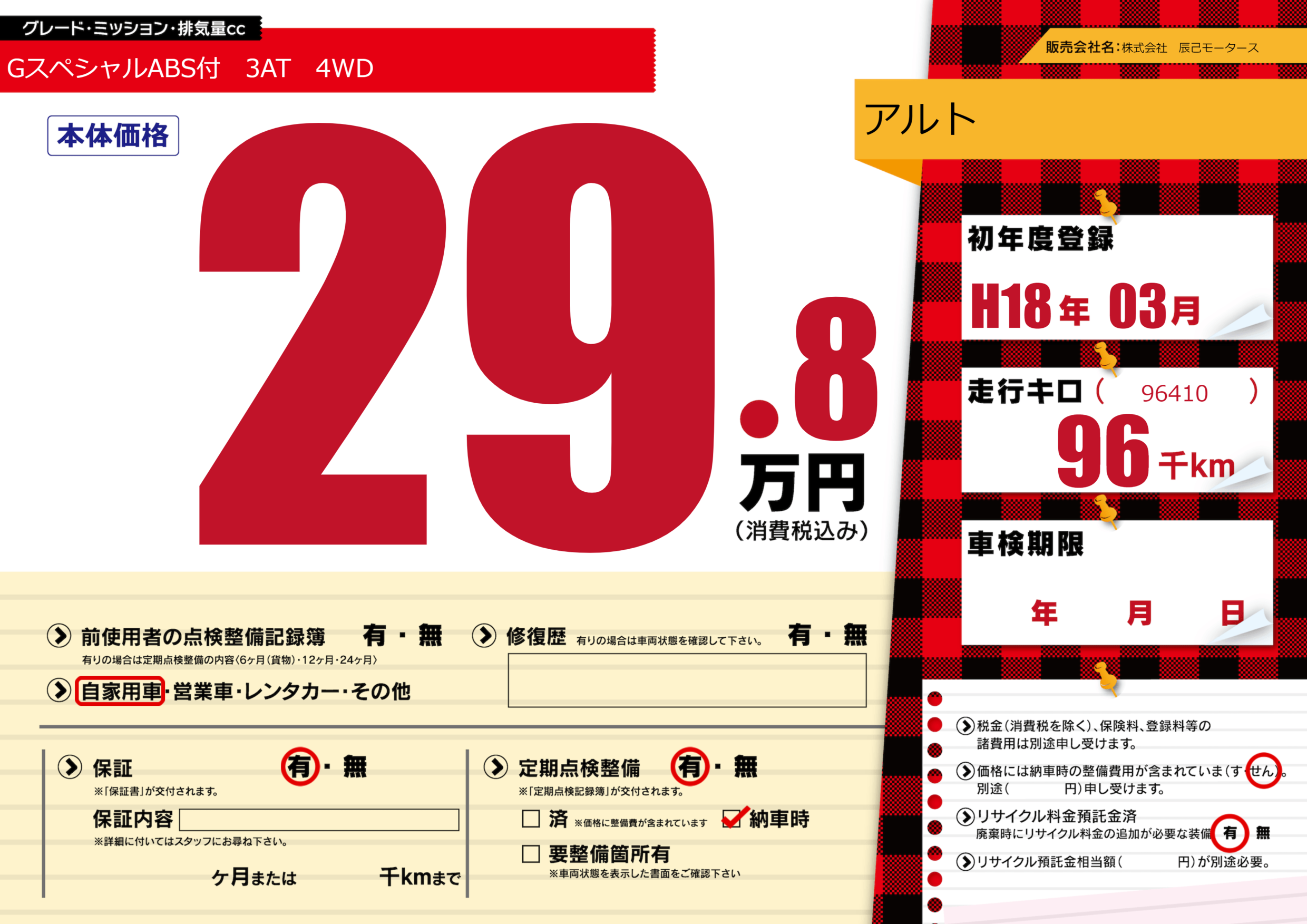 | 走行キロ | 9.6万km | 初年度登録 | H18年03月 |