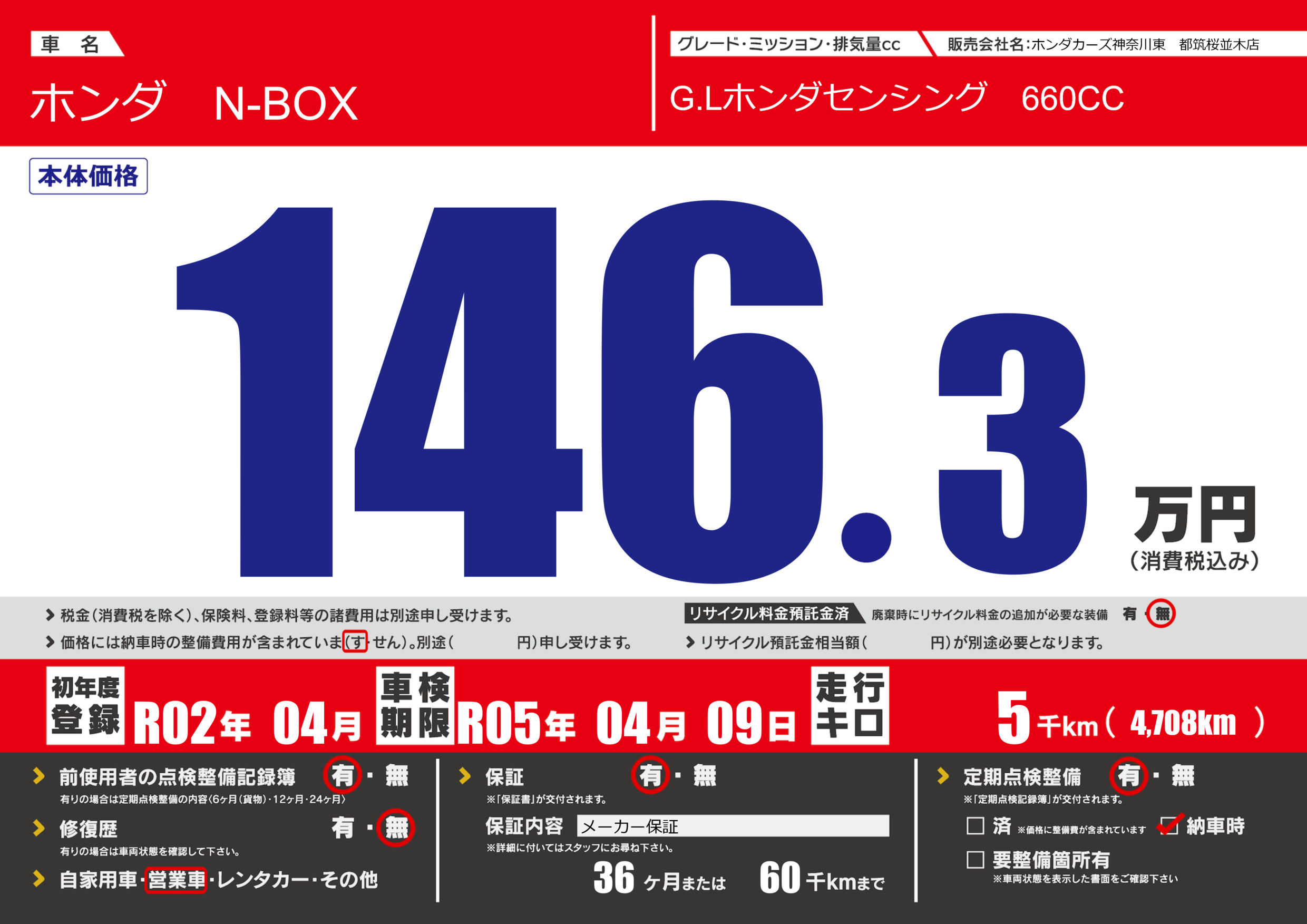| 車名 | ホンダ N-BOX | グレード ミッション 排気量 |