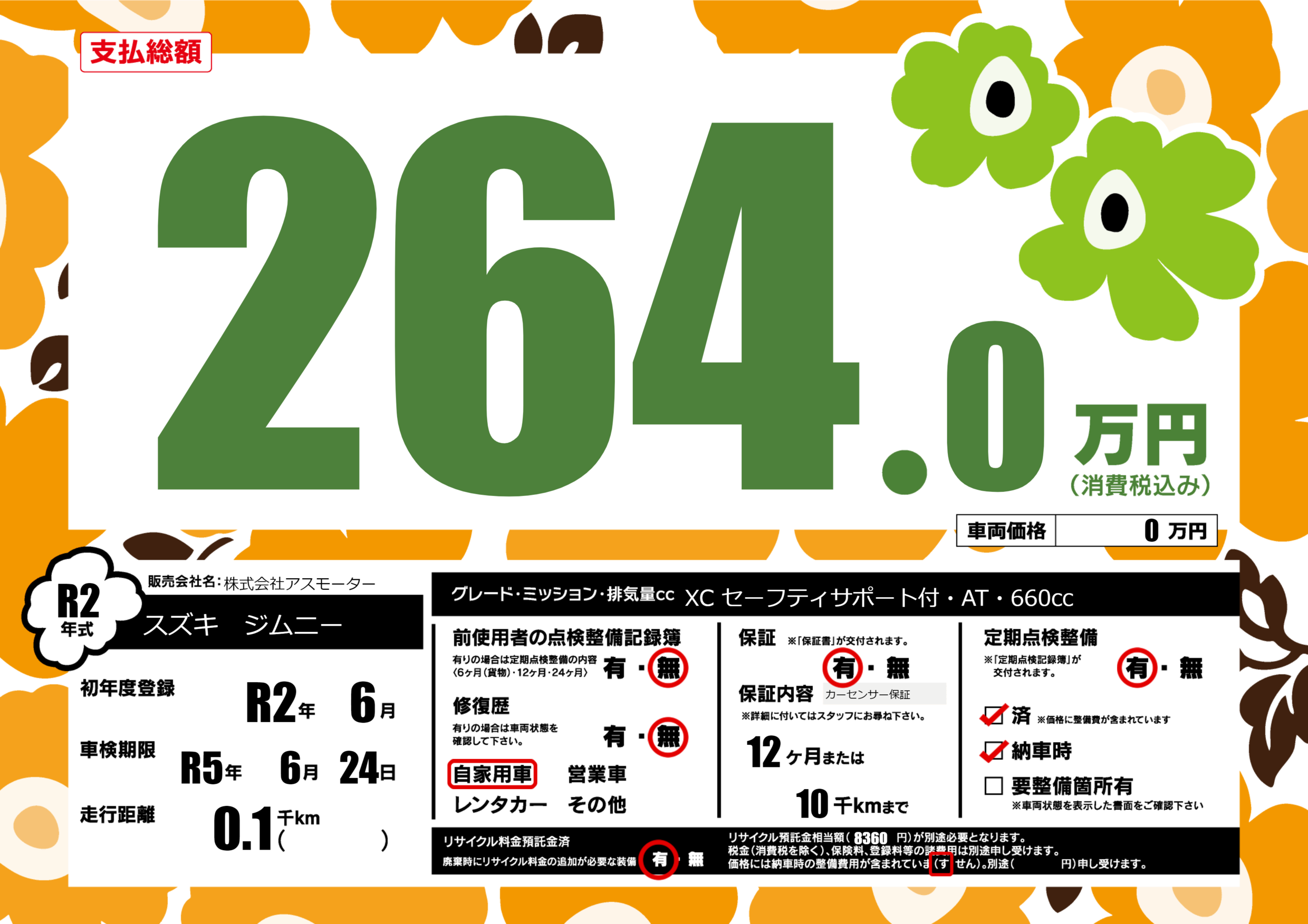 | 車名 | スズキ ジムニー | グレード ミッション 排気量 |