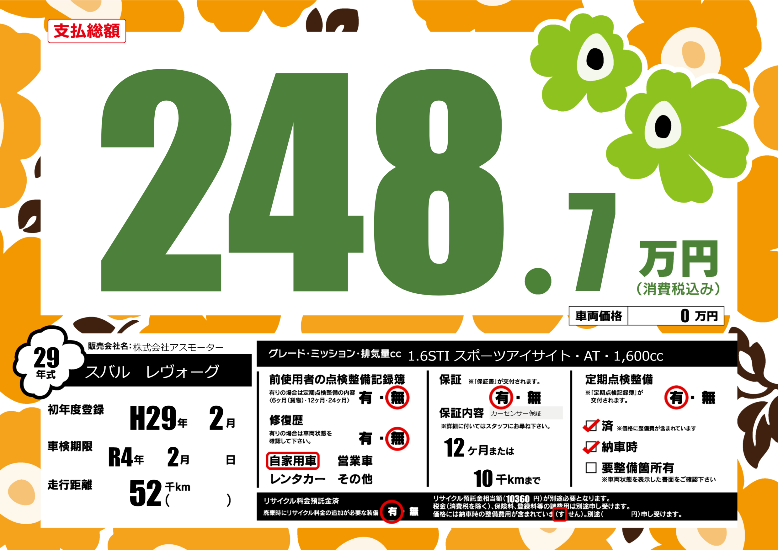 | 車名 | スバル レヴォーグ | グレード ミッション 排気量 |