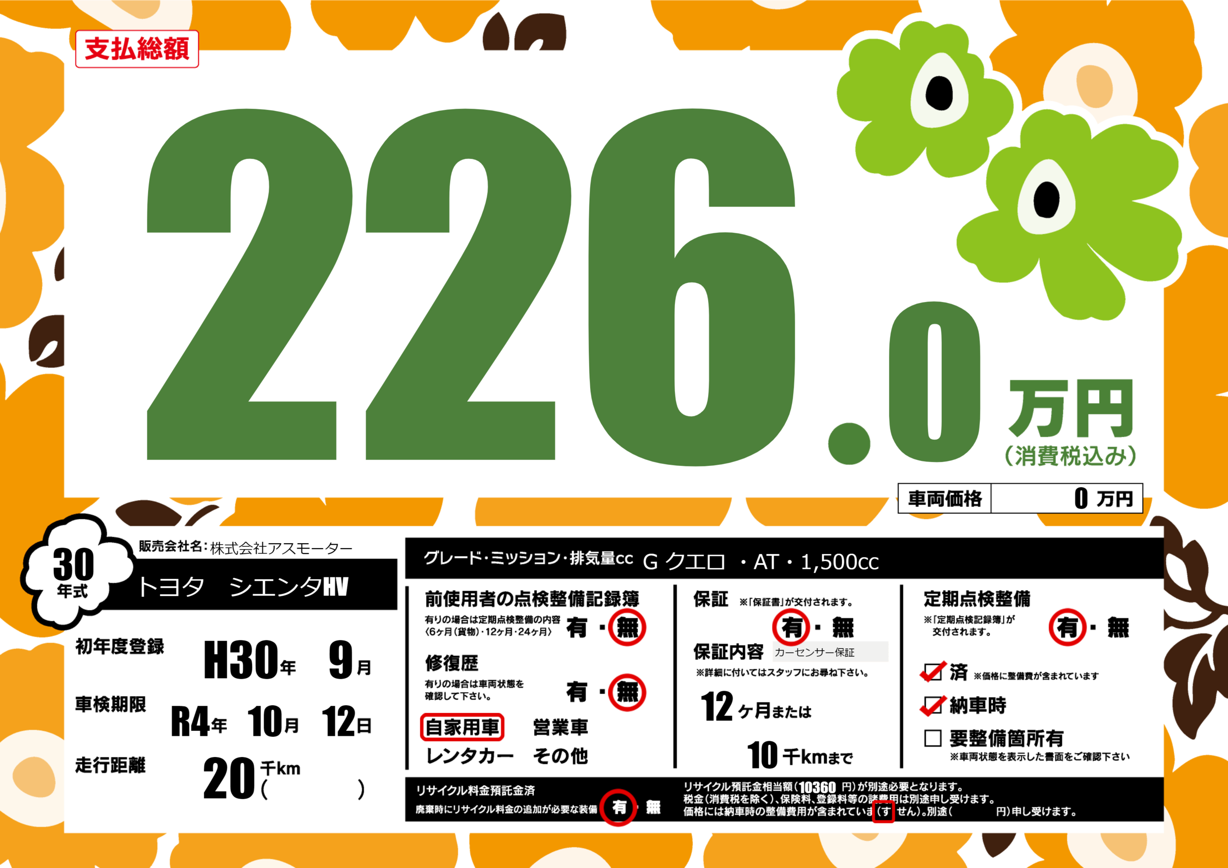 | 車名 | トヨタ シエンタHV | グレード ミッション 排気量 |