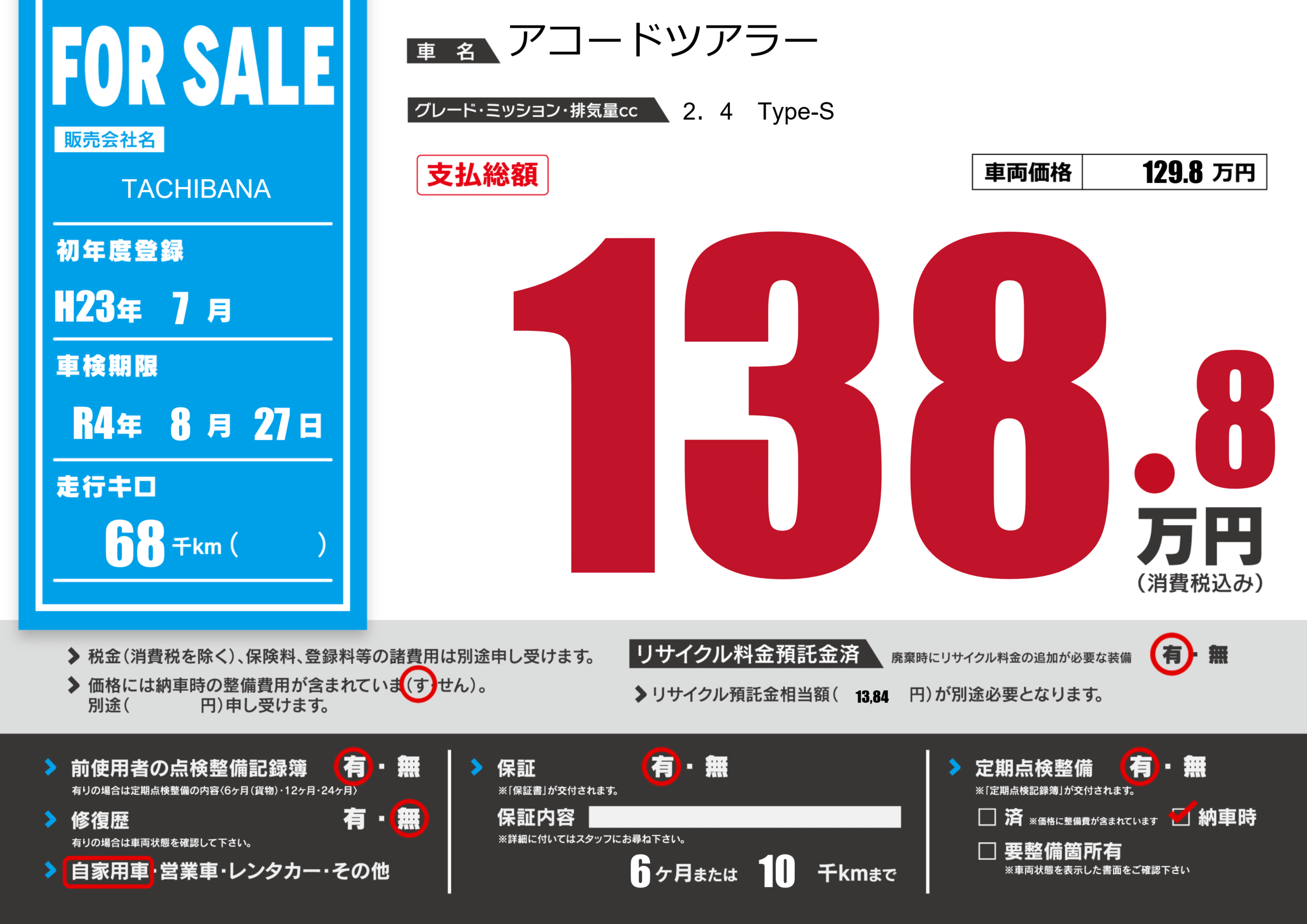 | 定期点検整備 | 定期点検整備あり 納車時あり | ||