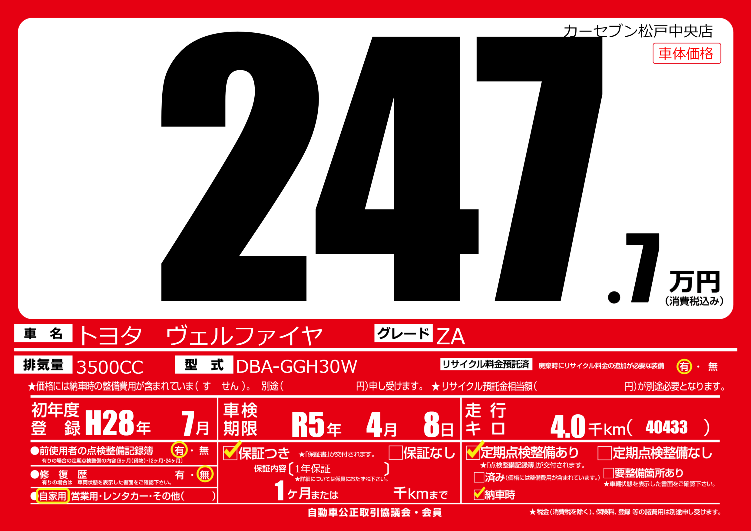 | 車名 | トヨタ ヴェルファイヤ | グレード ミッション 排気量 |