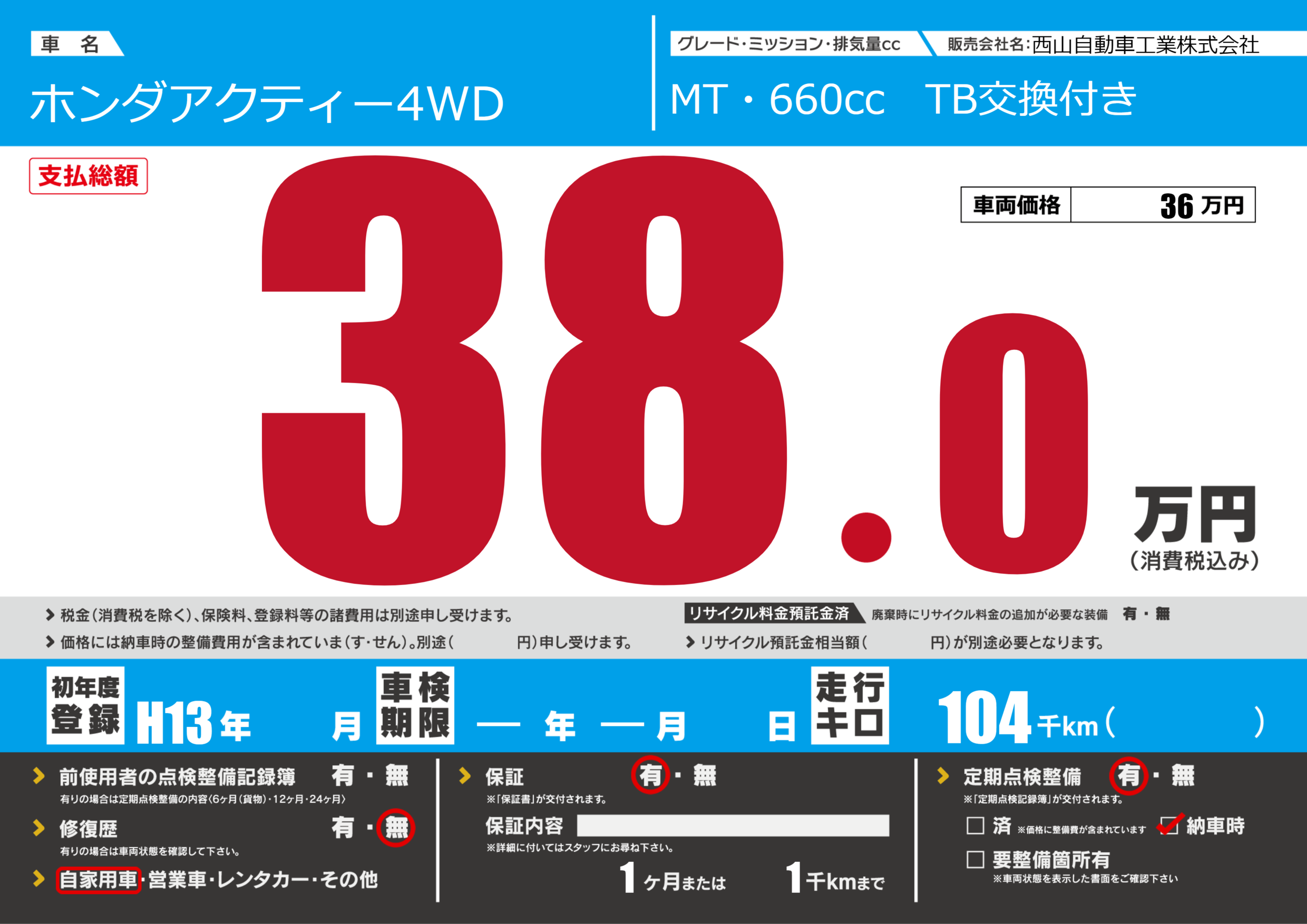| 車名 | ホンダアクティー4WD | グレード ミッション 排気量 |