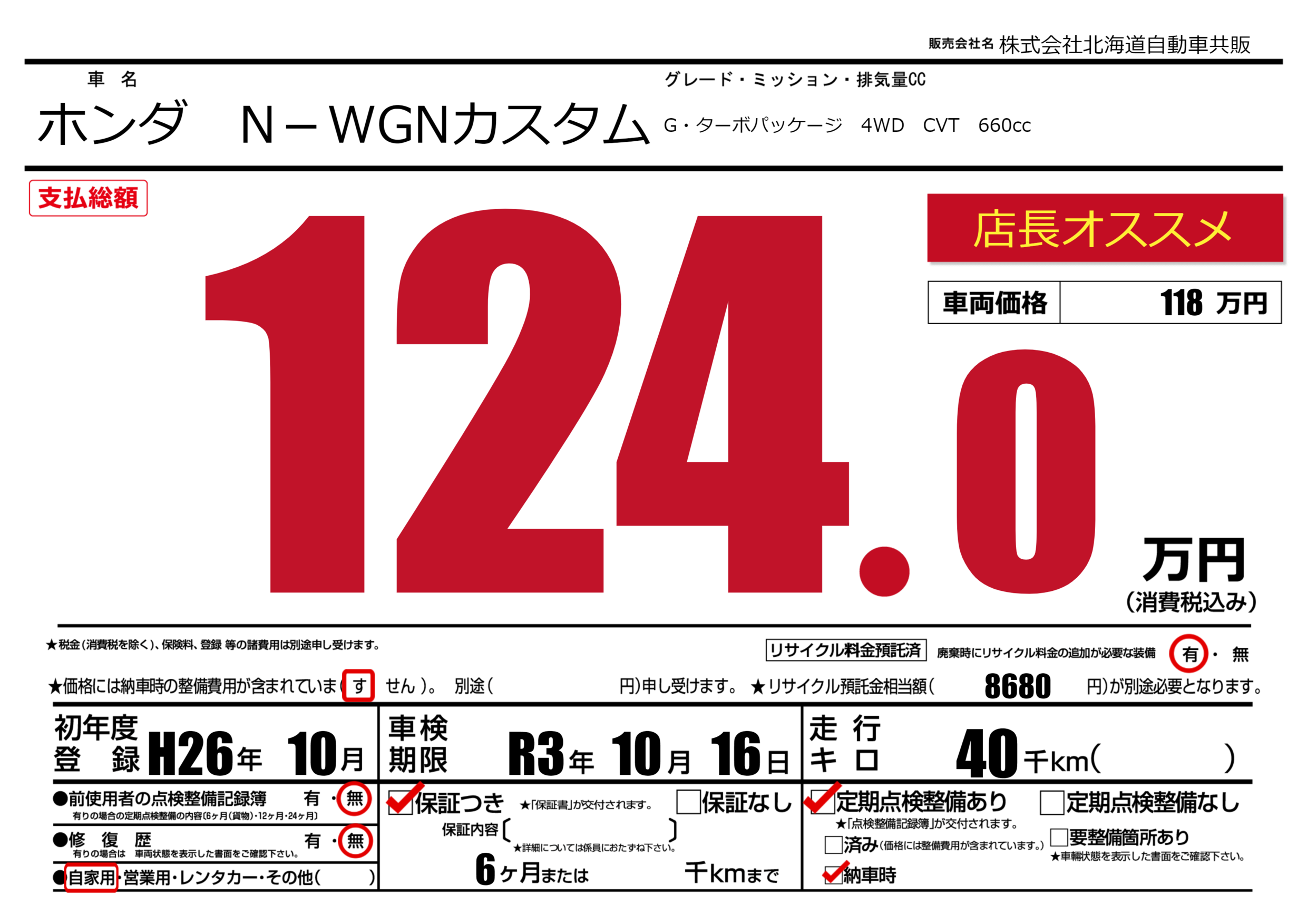 | 車名 | ホンダ N-WGNカスタム | グレード ミッション 排気量 |