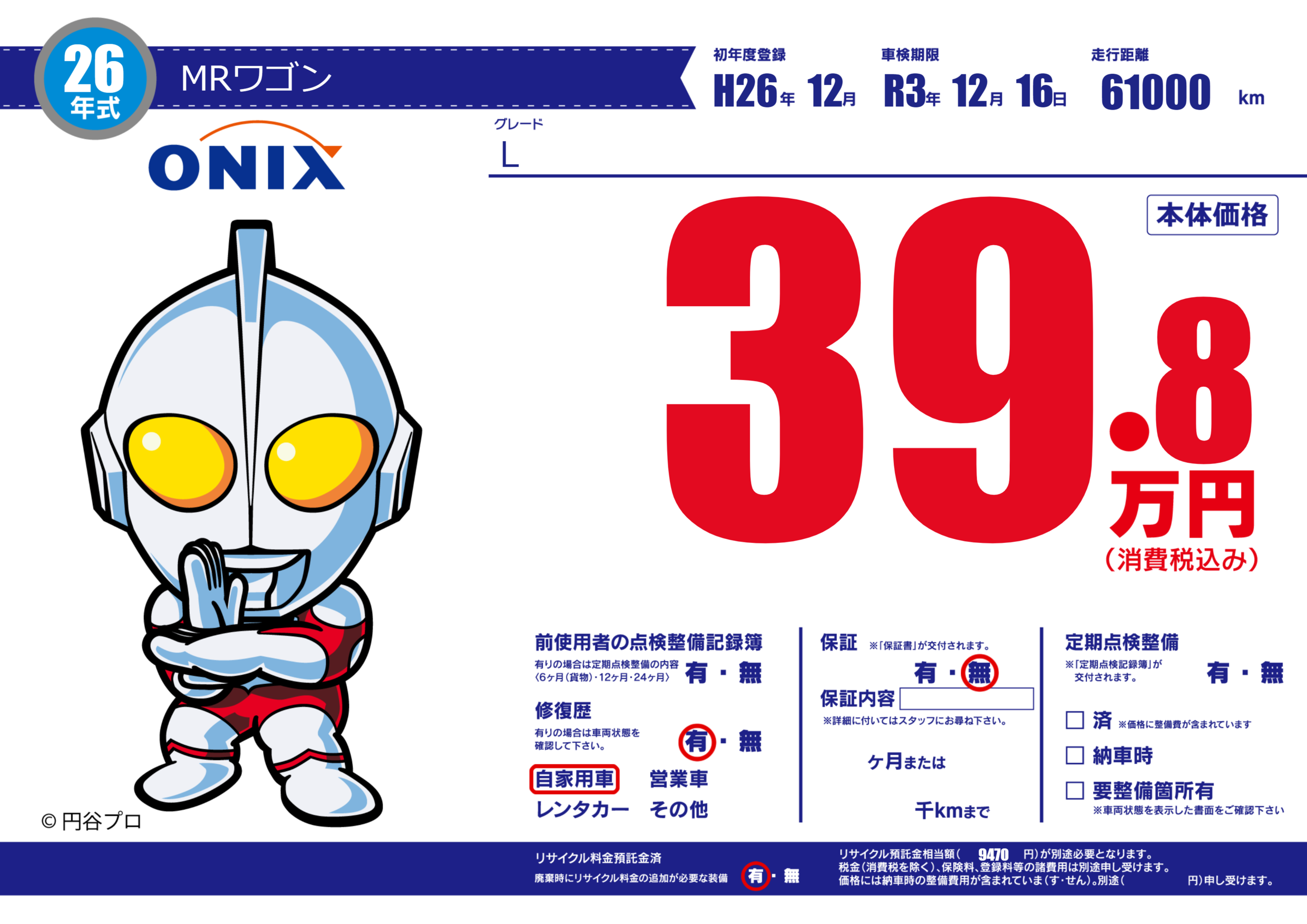| 車名 | MRワゴン | グレード ミッション 排気量 |