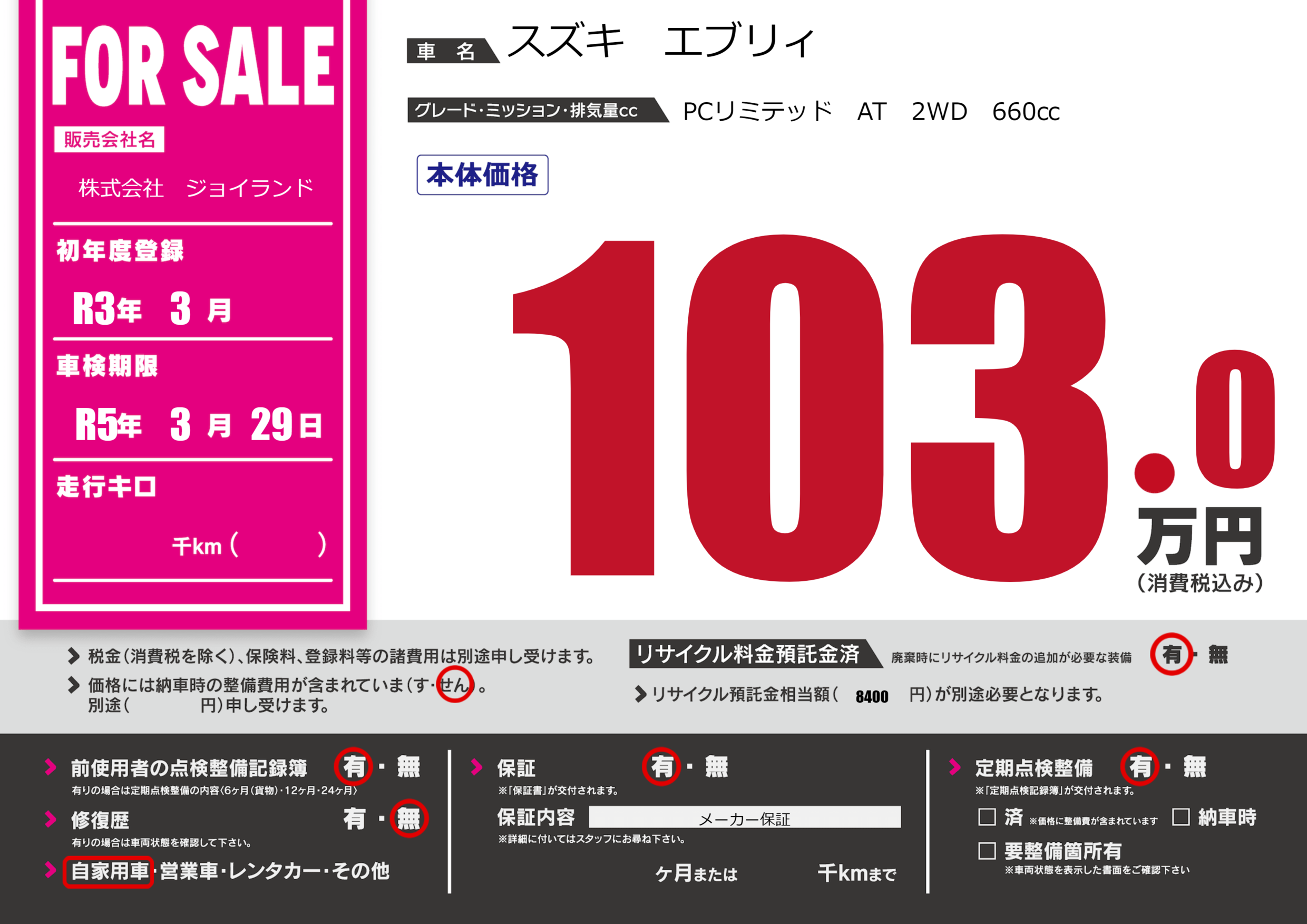 | 車名 | スズキ エブリィ | グレード ミッション 排気量 |