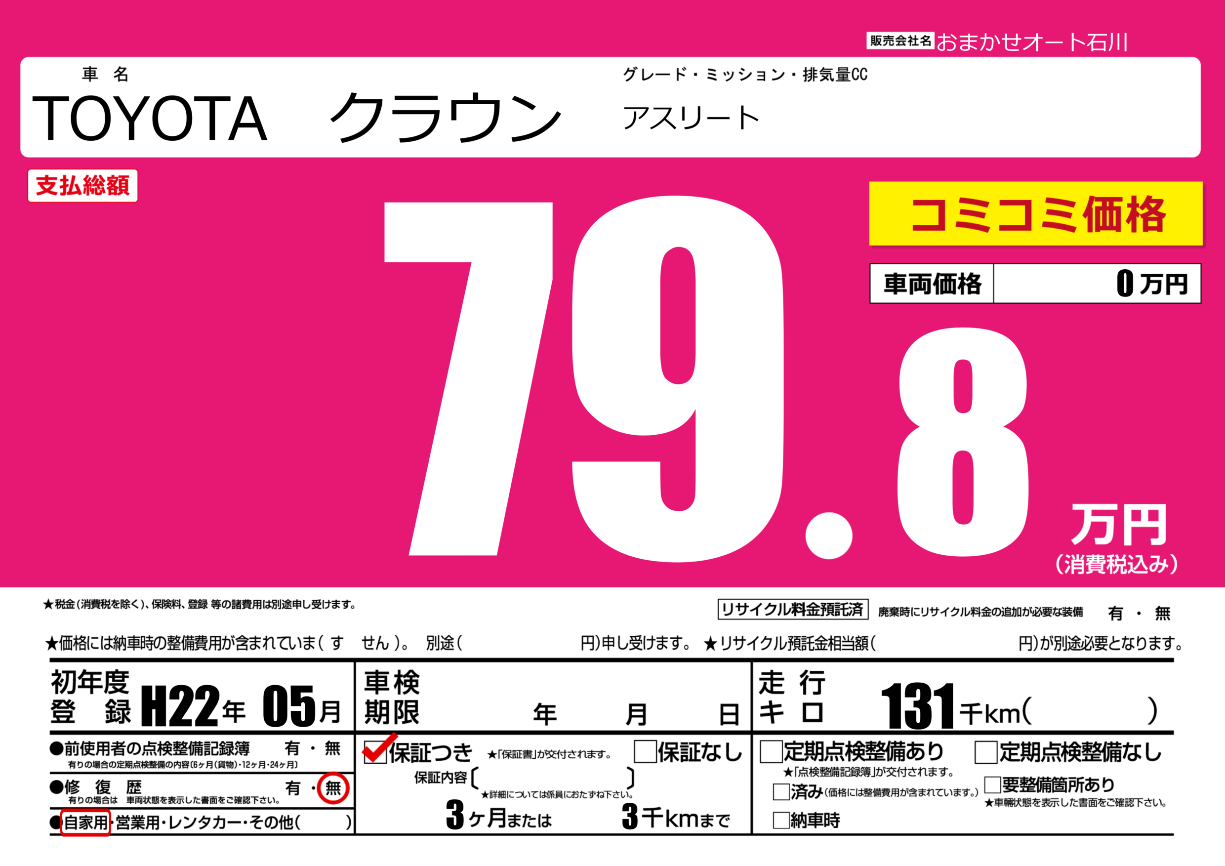 | 車名 | TOYOTA クラウン | グレード ミッション 排気量 |