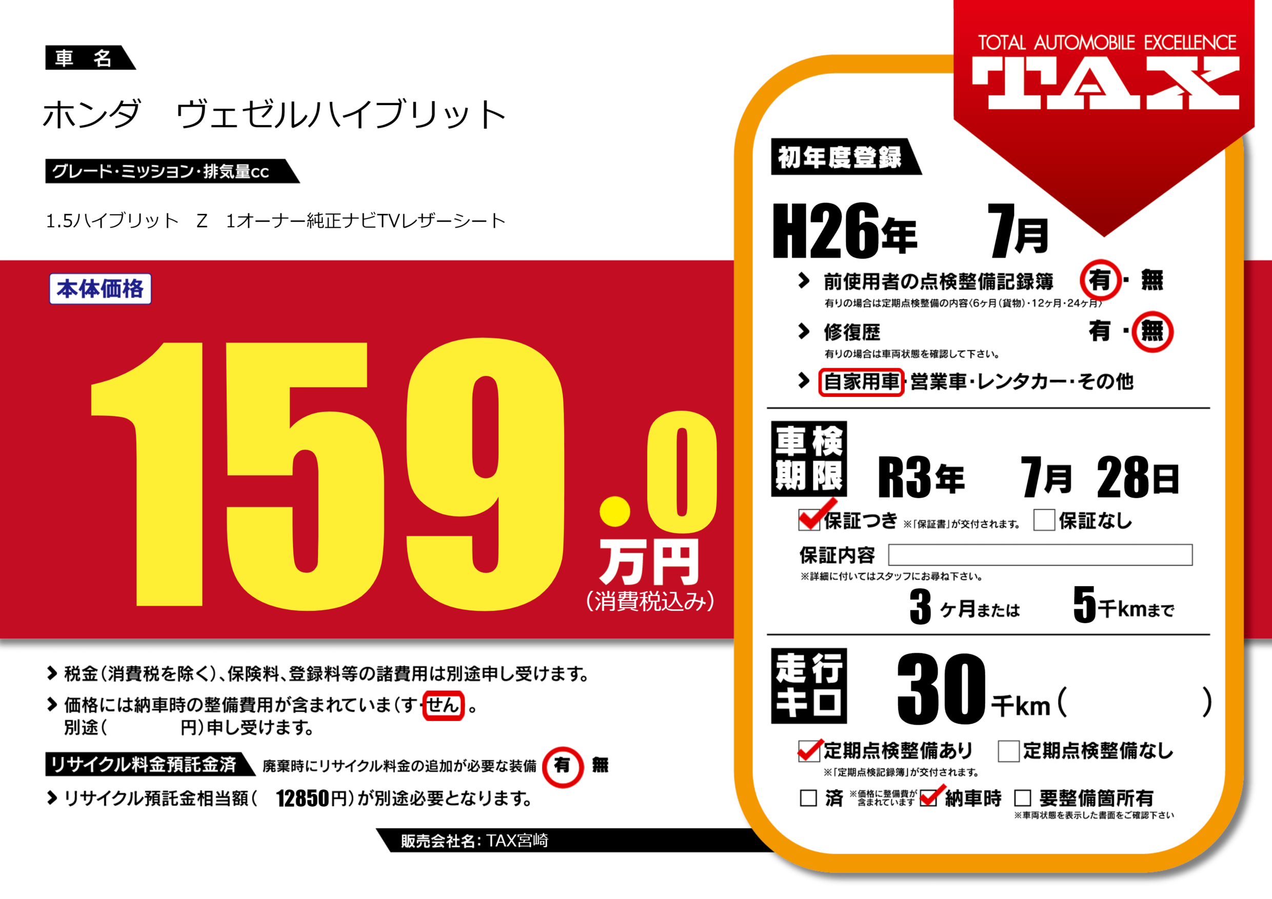 | 走行キロ | 3万km | 初年度登録 | H26年7月 |