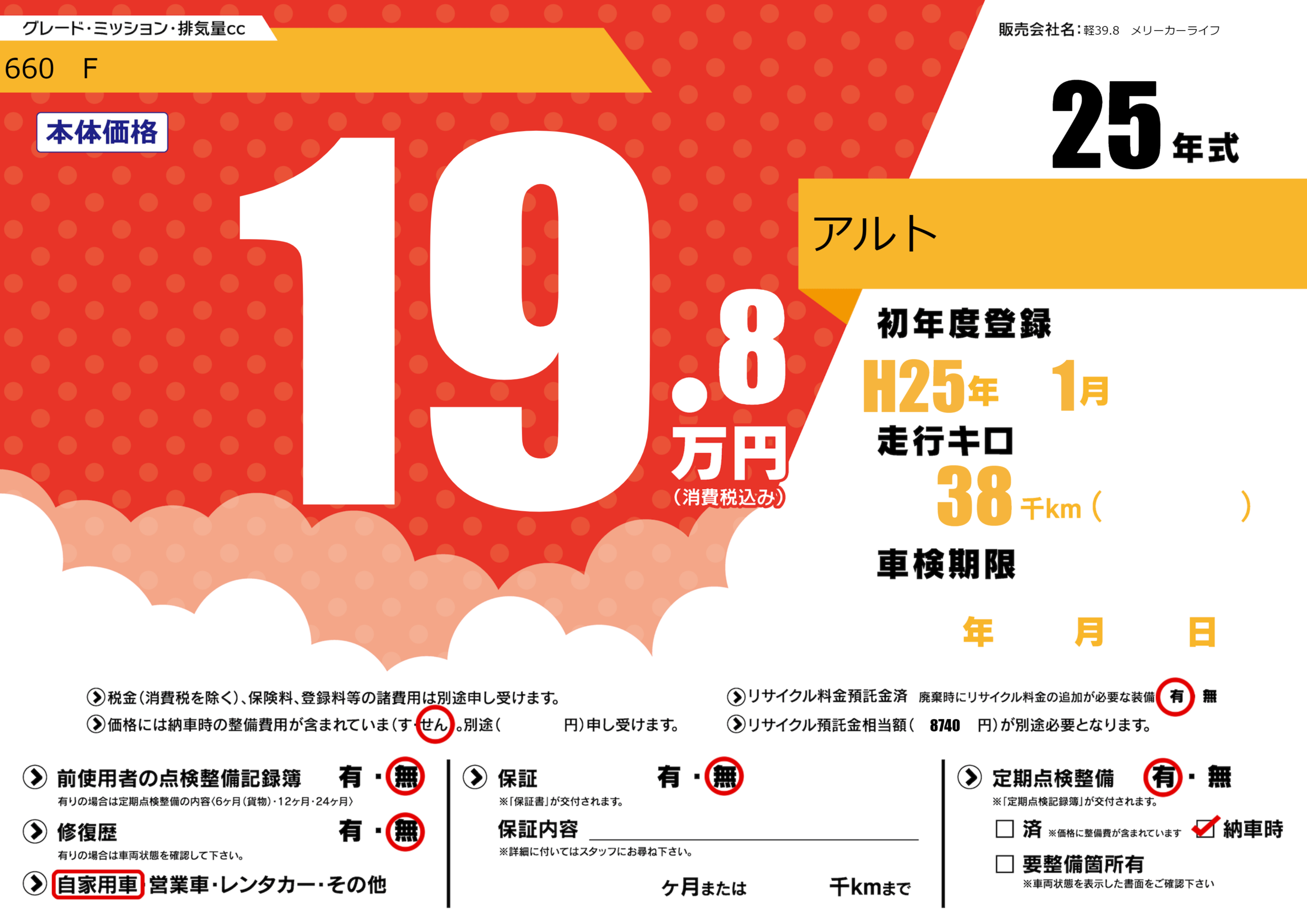 | 定期点検整備 | 定期点検整備あり 納車時あり | ||