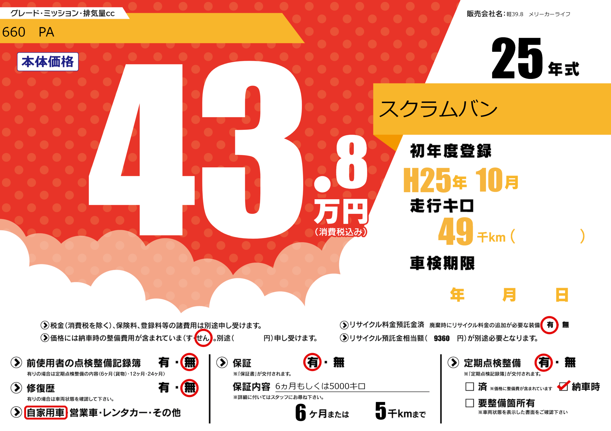 | 車名 | スクラムバン | グレード ミッション 排気量 |