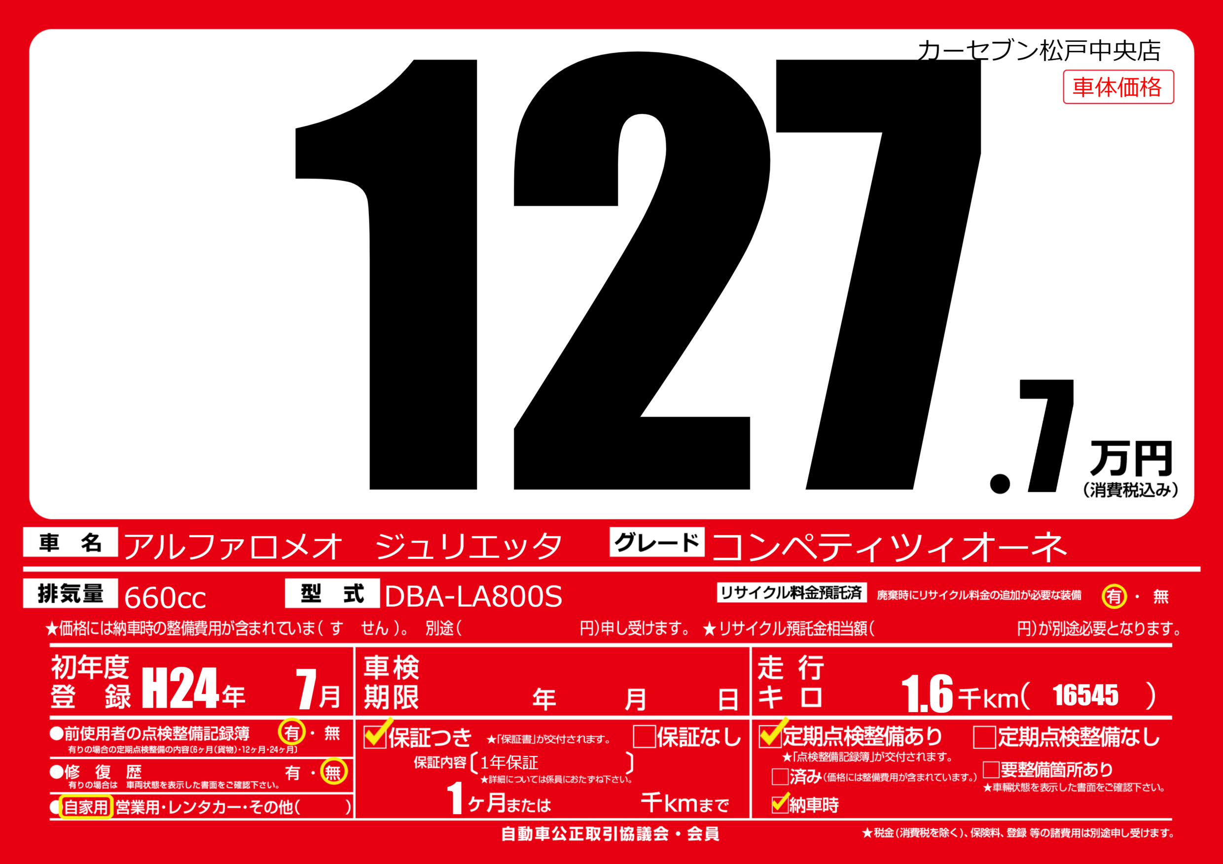 | 車名 | アルファロメオ ジュリエッタ | グレード ミッション 排気量 |