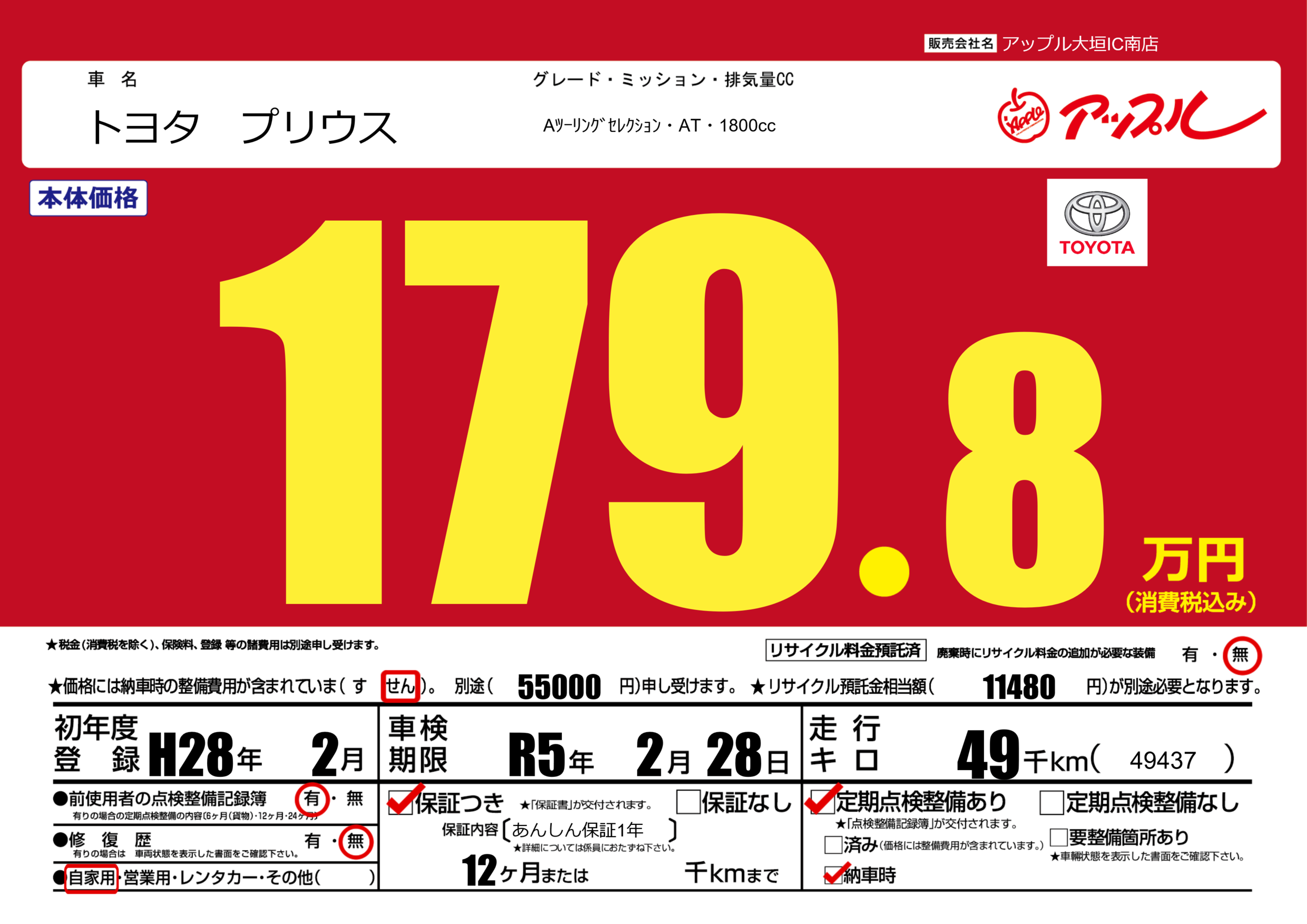 | 車名 | トヨタ プリウス | グレード ミッション 排気量 |