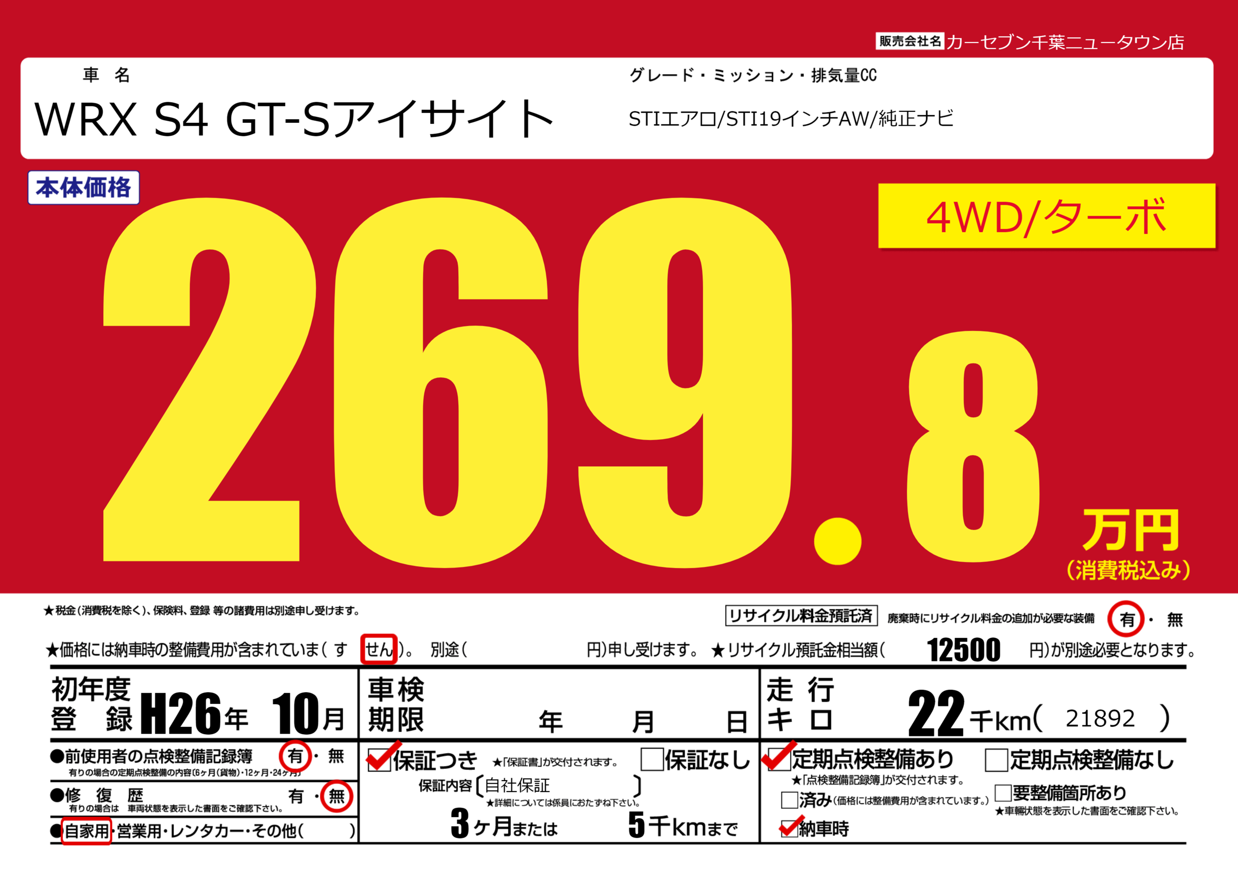 | 車名 | WRX S4 GT-Sアイサイト | グレード ミッション 排気量 |