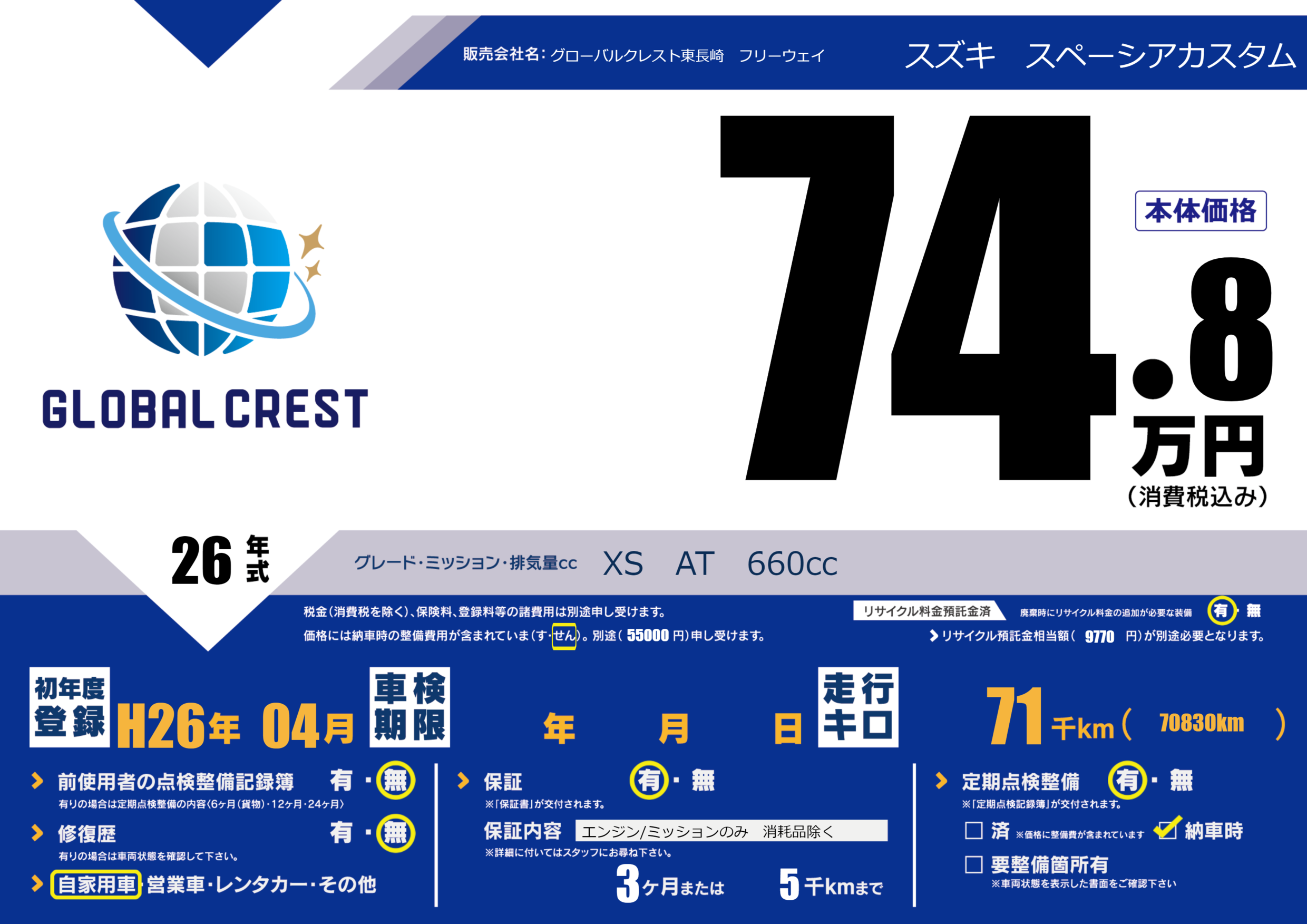 | 車名 | スズキ スペーシアカスタム | グレード ミッション 排気量 |