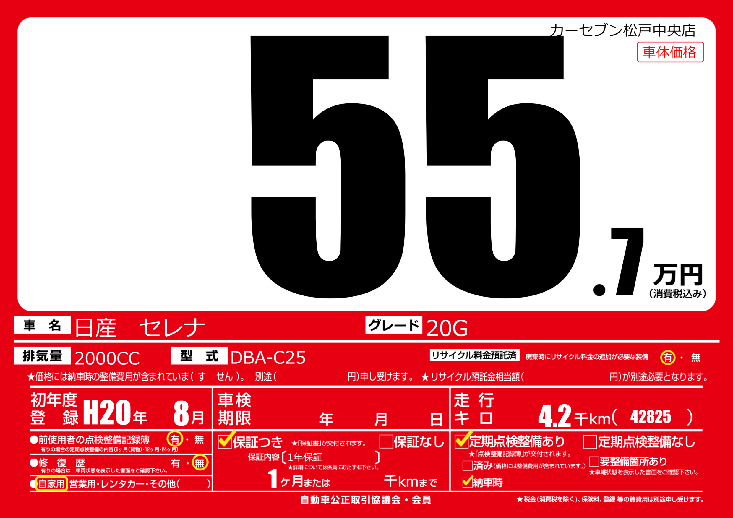 | 車名 | 日産 セレナ | グレード ミッション 排気量 |