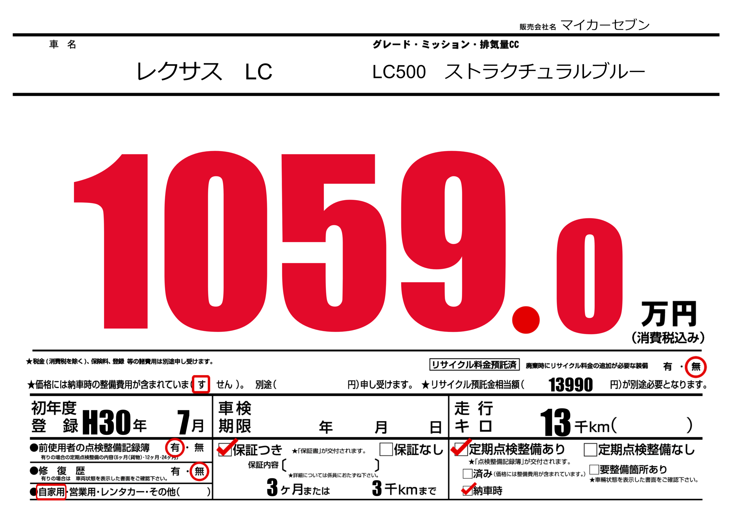 | 定期点検整備 | 定期点検整備あり 納車時あり | ||