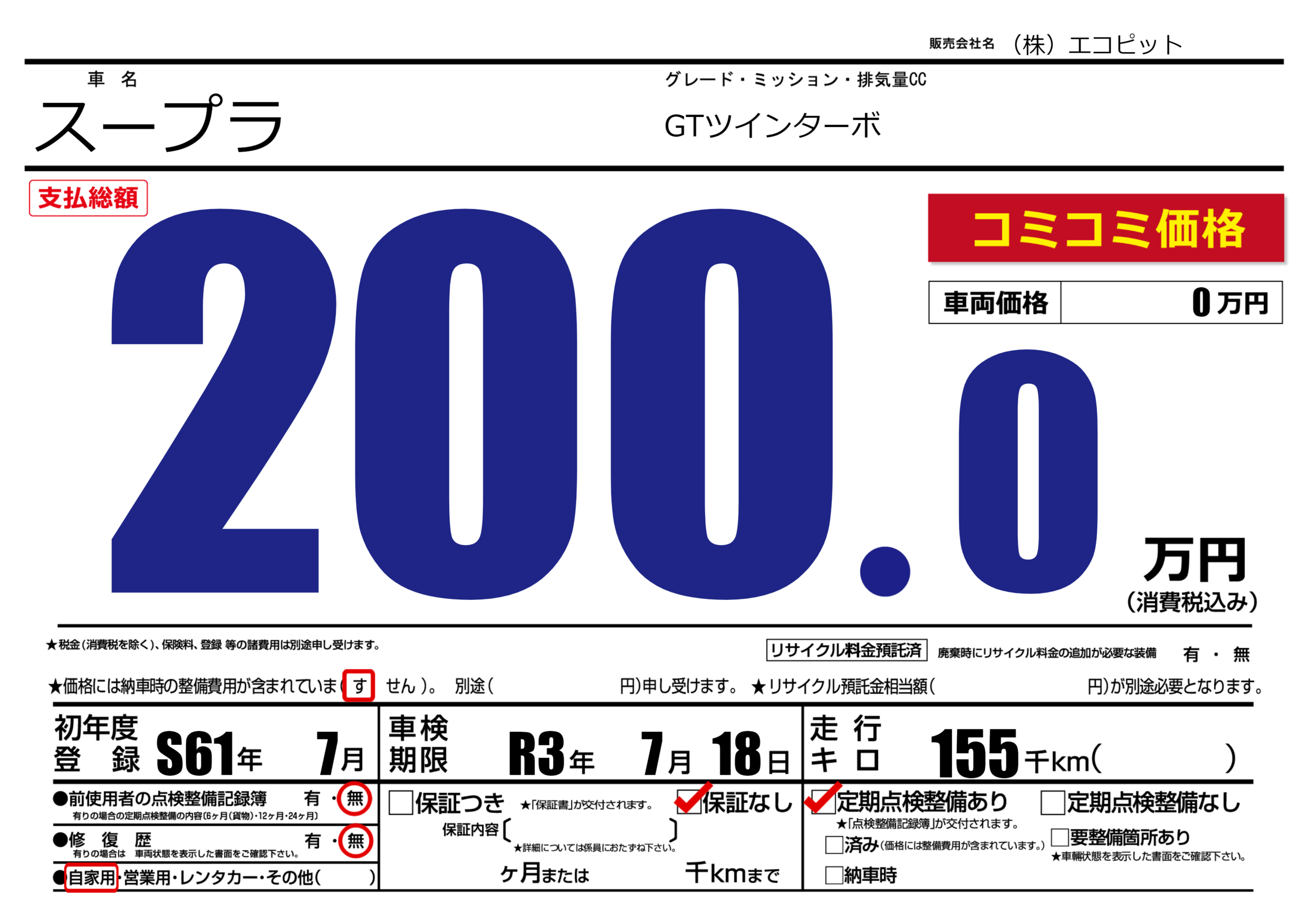 | 走行キロ | 15.5万km | 初年度登録 | S61年7月 |