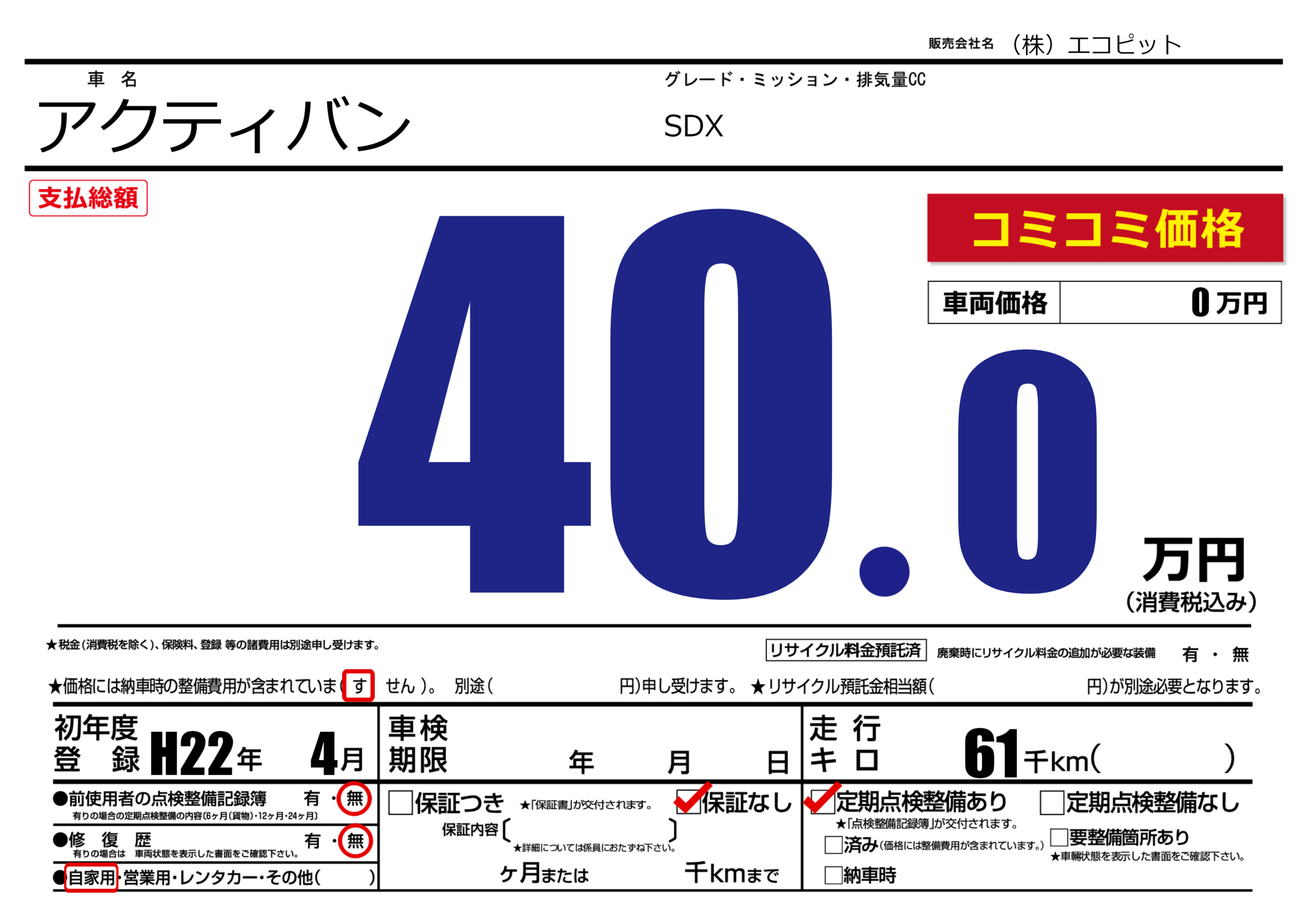 | 車名 | アクティバン | グレード ミッション 排気量 |