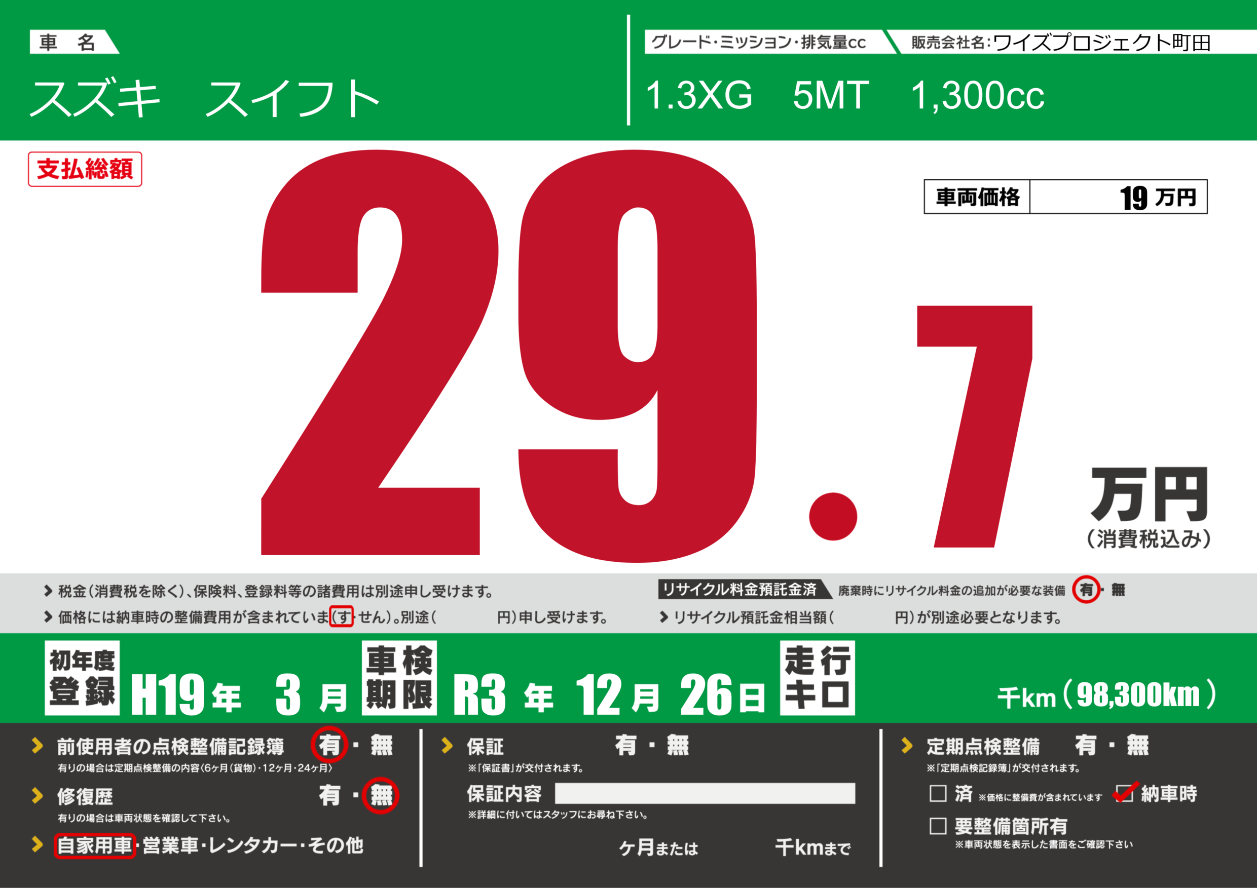 | 車名 | スズキ スイフト | グレード ミッション 排気量 |