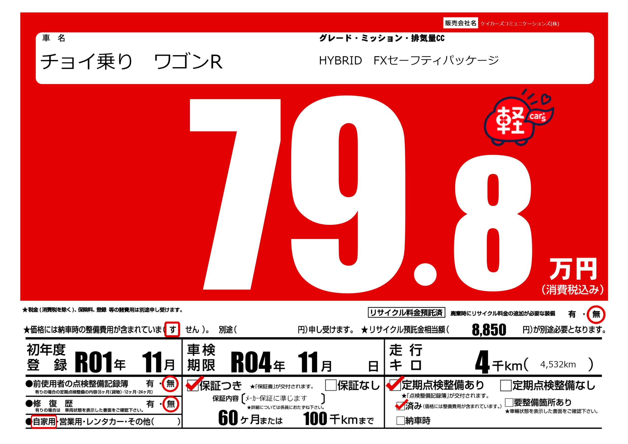 | 車名 | チョイ乗り ワゴンR | グレード ミッション 排気量 |