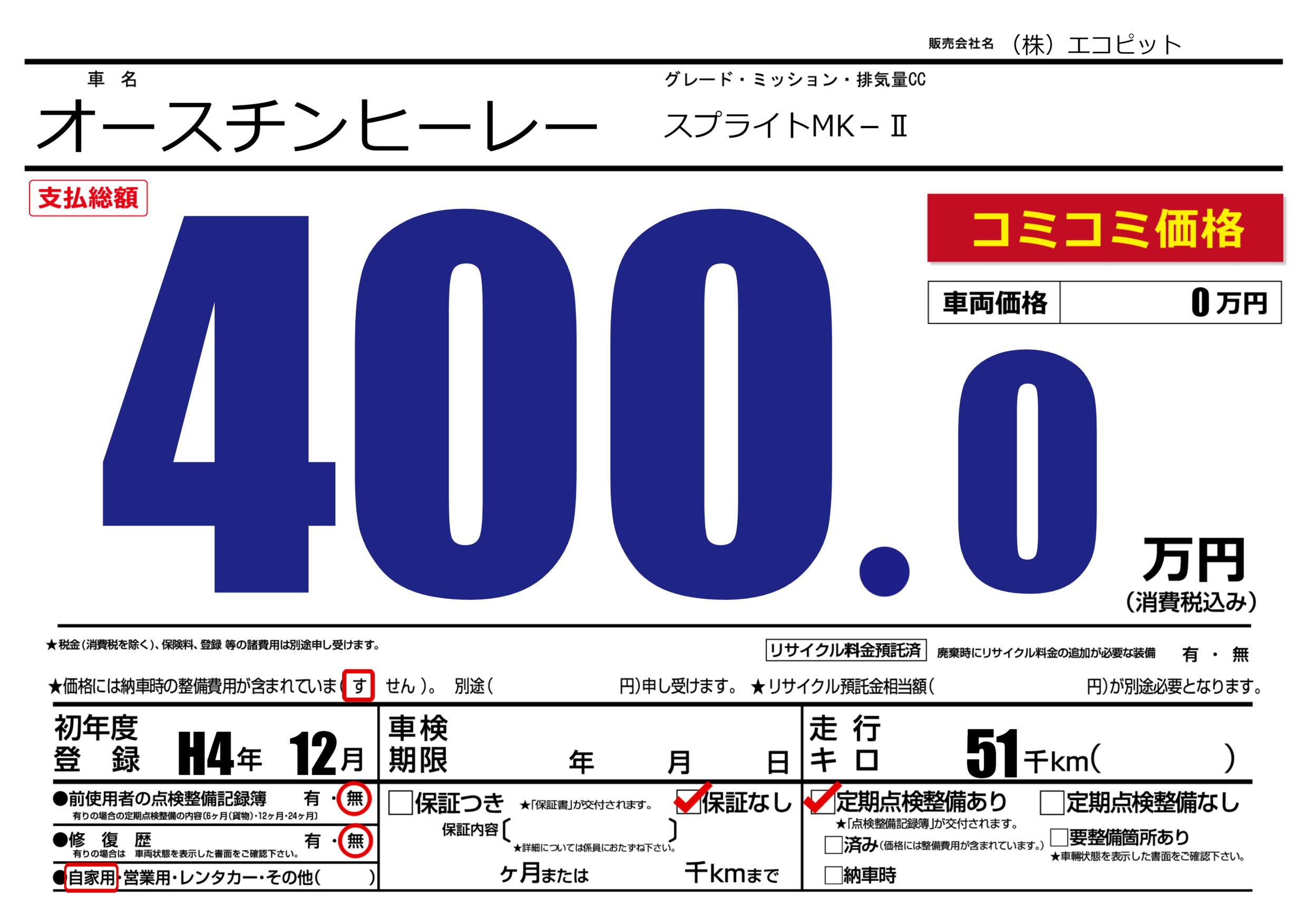 | 走行キロ | 5.1万km | 初年度登録 | H4年12月 |