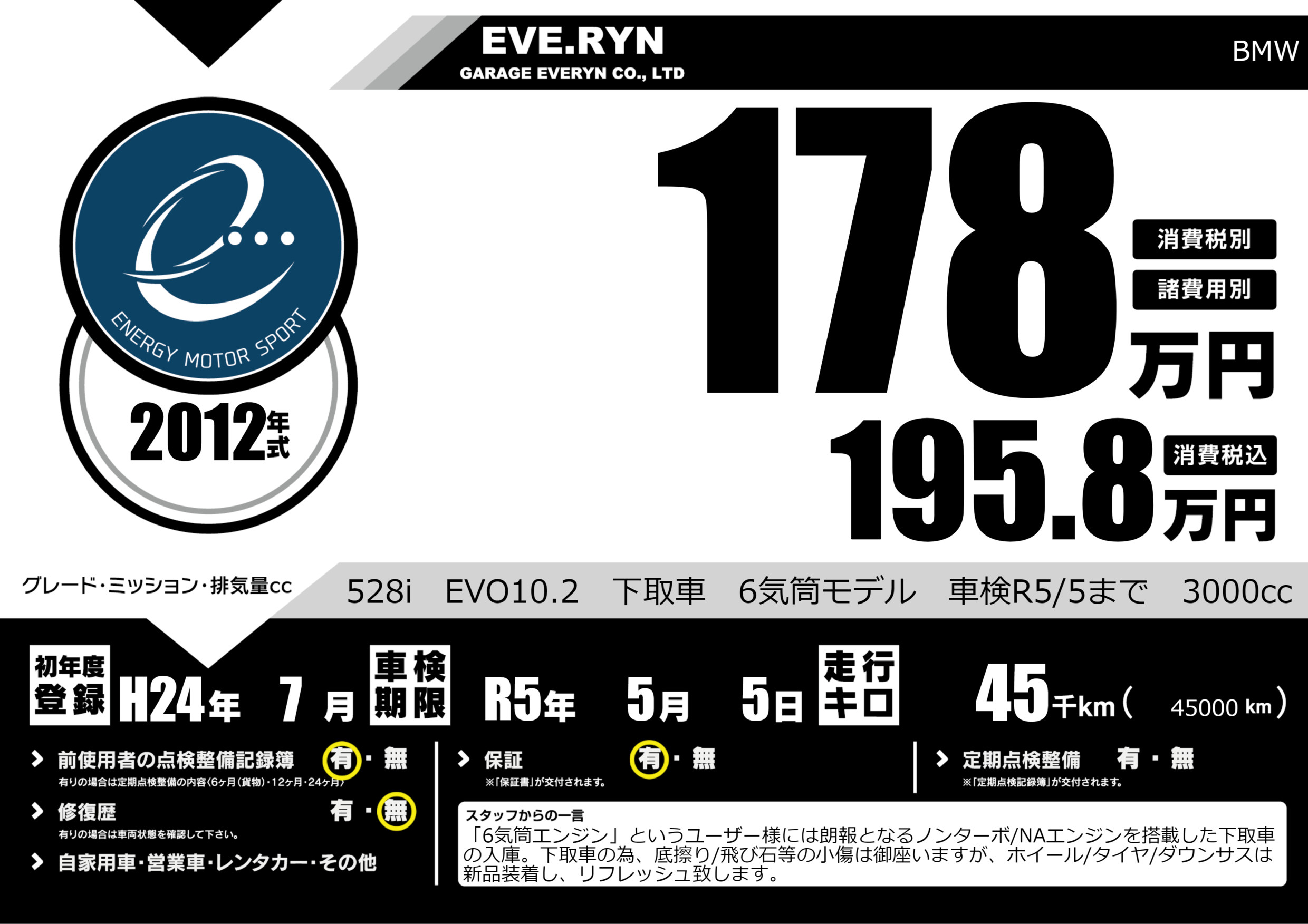528i EVO10.2 下取車 6気筒モデル 車検R5/5まで 3000cc |