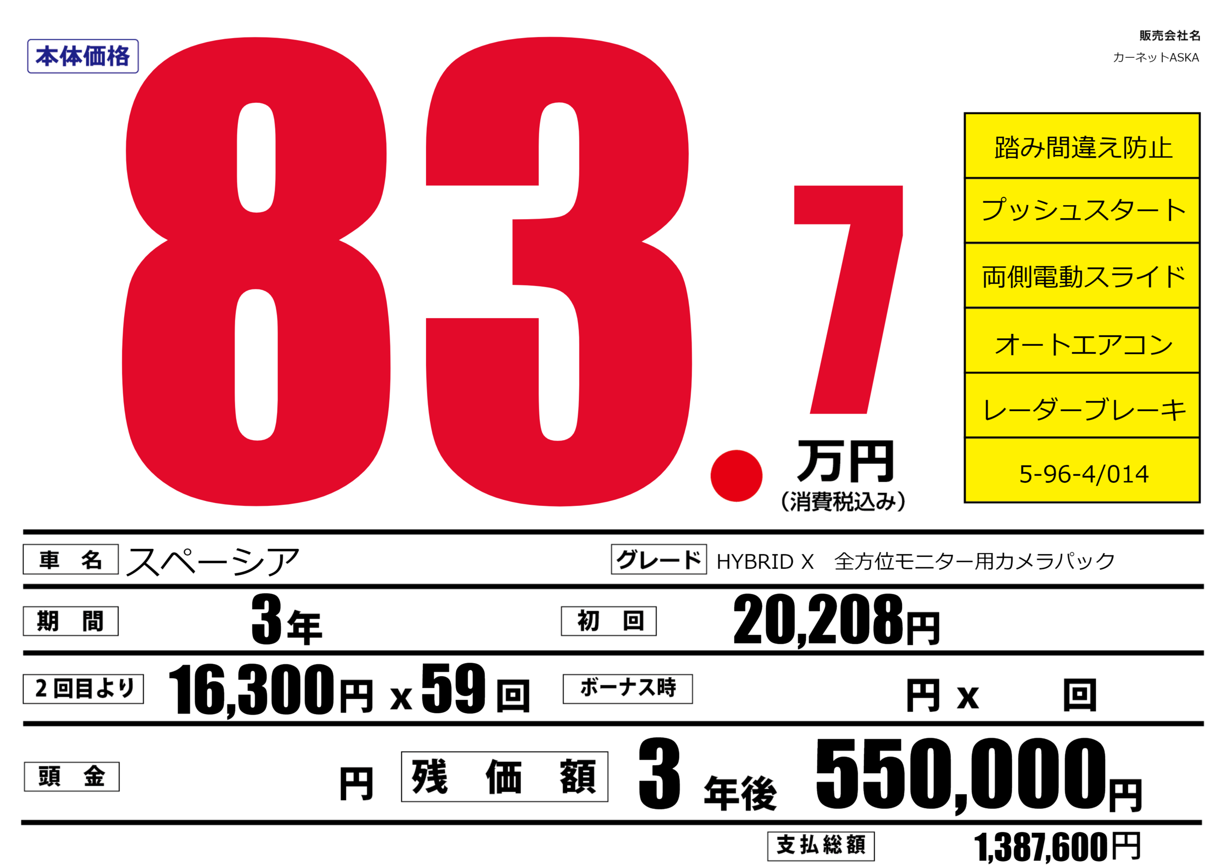 | 車名 | スペーシア | グレード ミッション 排気量 |
