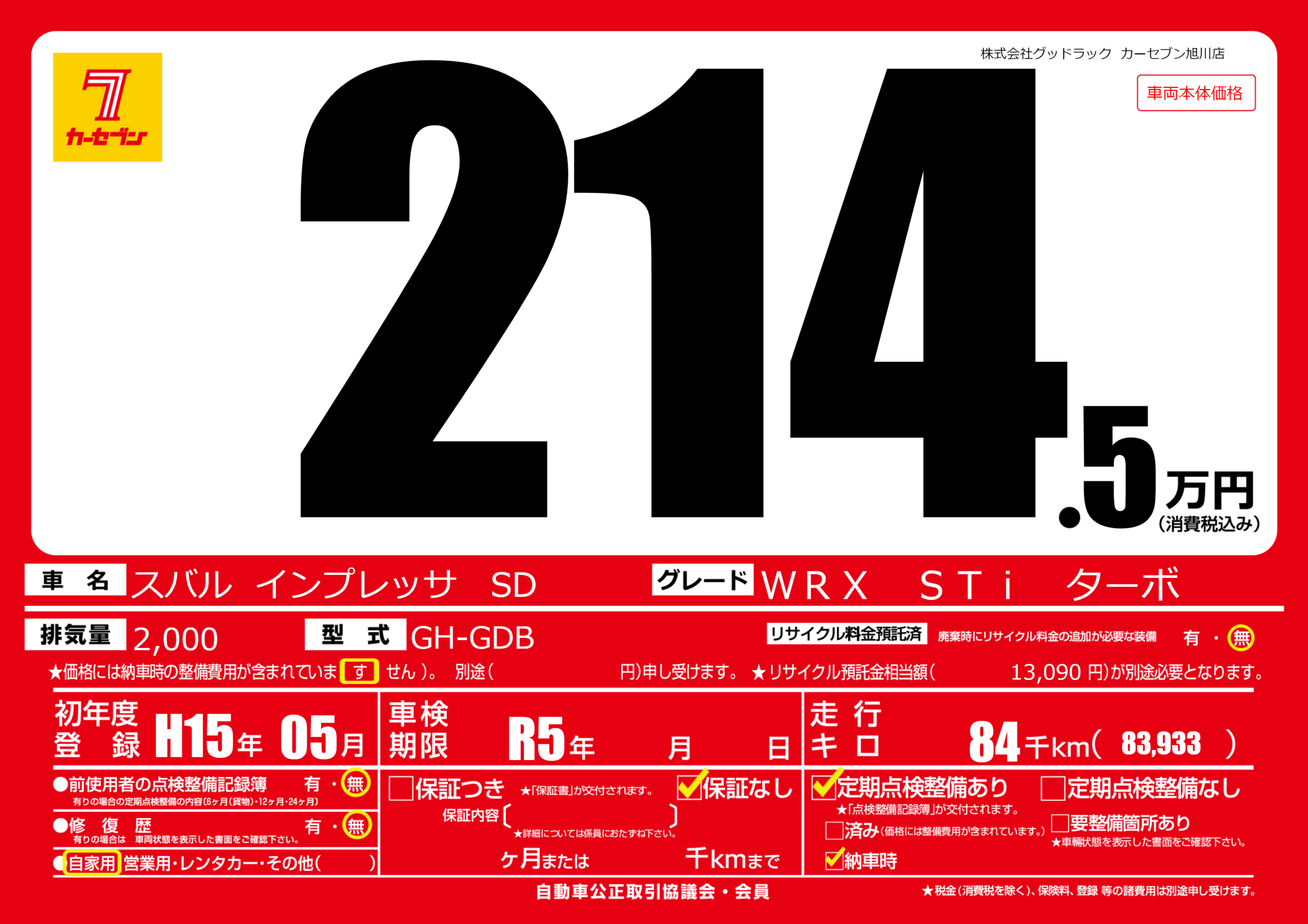 | 車検制限 | R5年 - 月 - 日 | ||