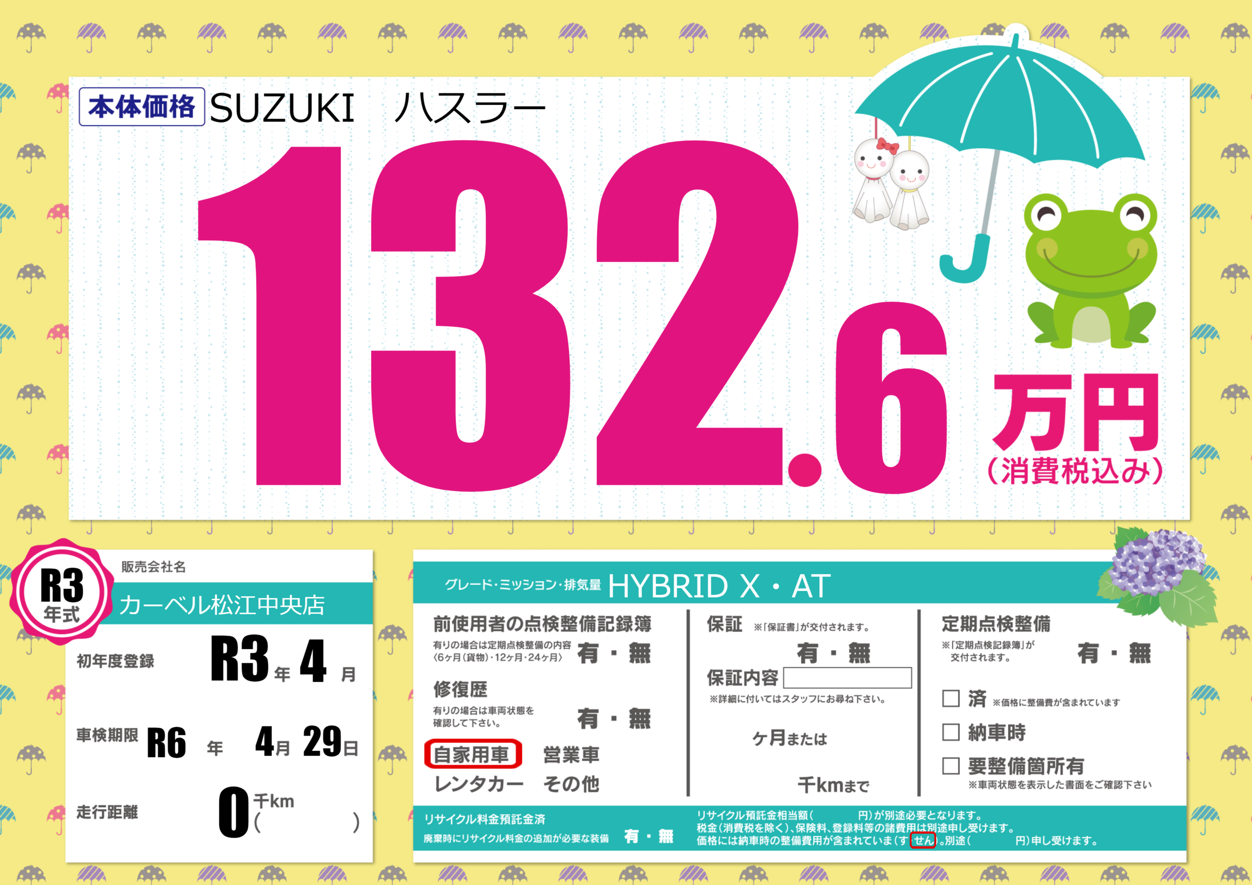 | 車名 | SUZUKI ハスラー | グレード ミッション 排気量 |