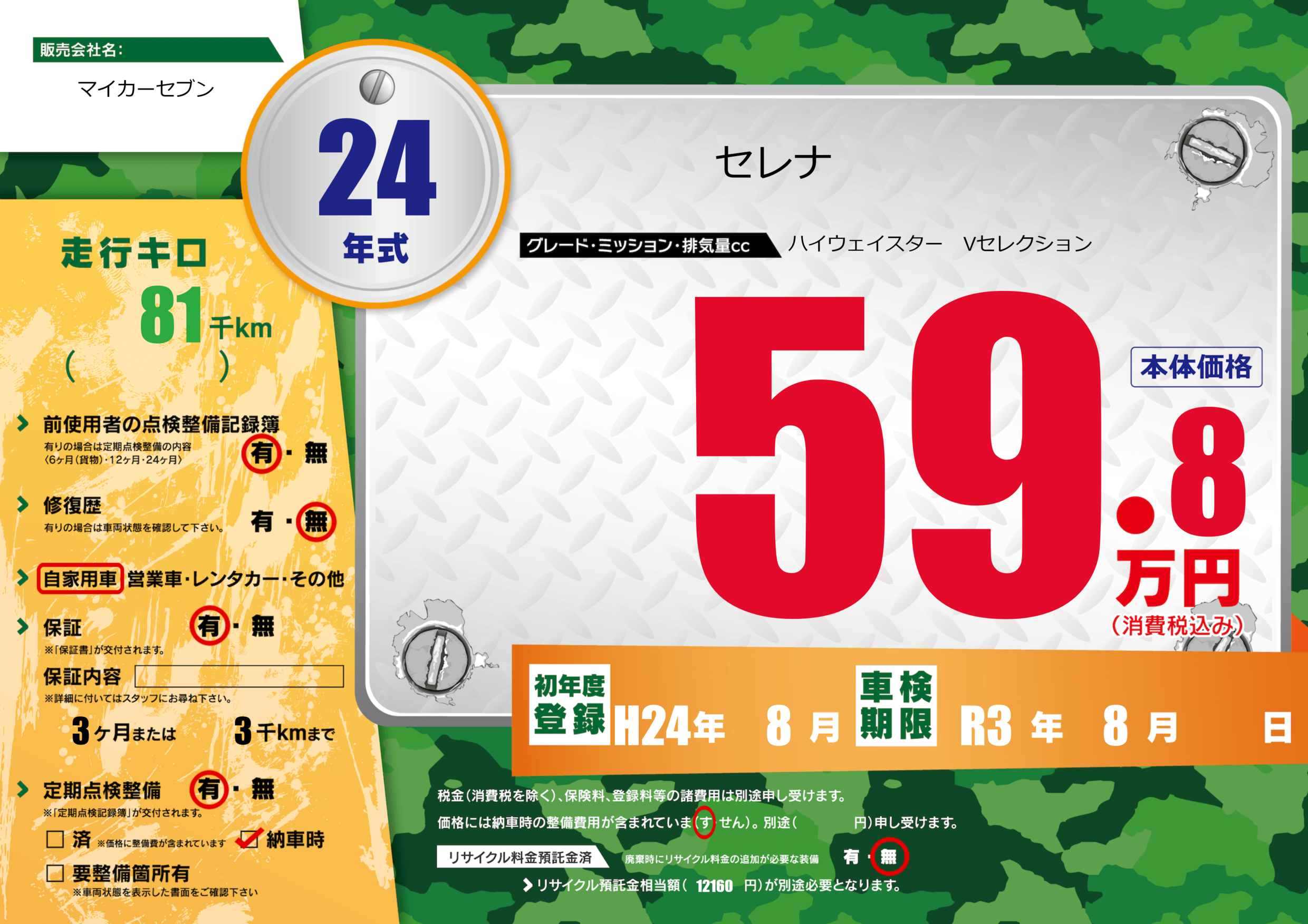 | 走行キロ | 8.1万km | 初年度登録 | H24年8月 |