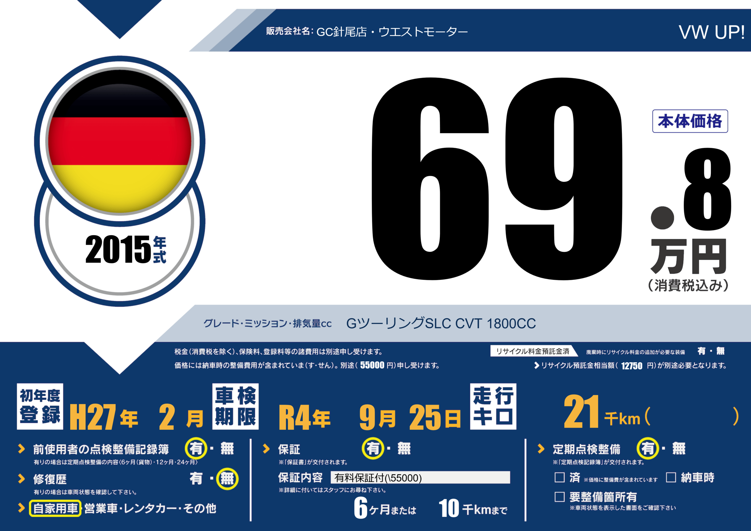 | 車名 | VW UP! | グレード ミッション 排気量 |