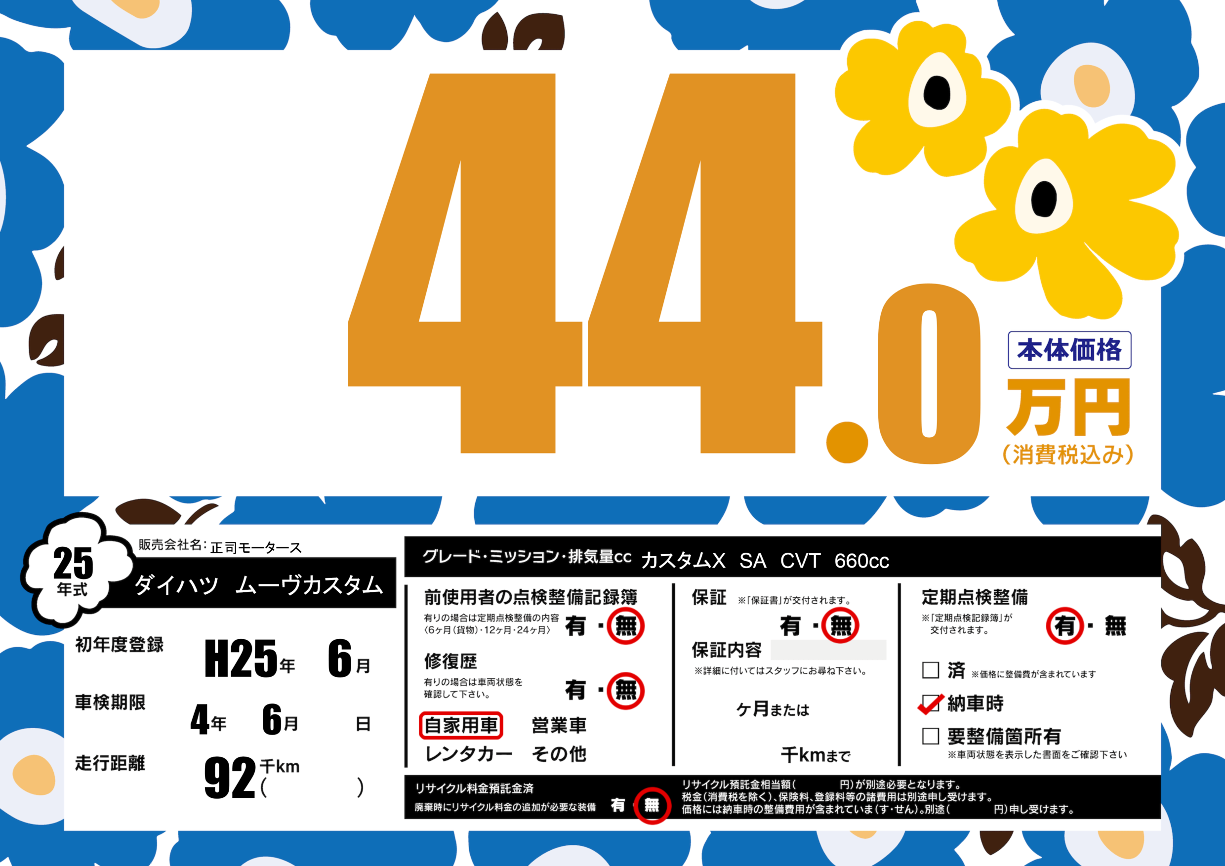 | 走行キロ | 9.2万km | 初年度登録 | H25年6月 |