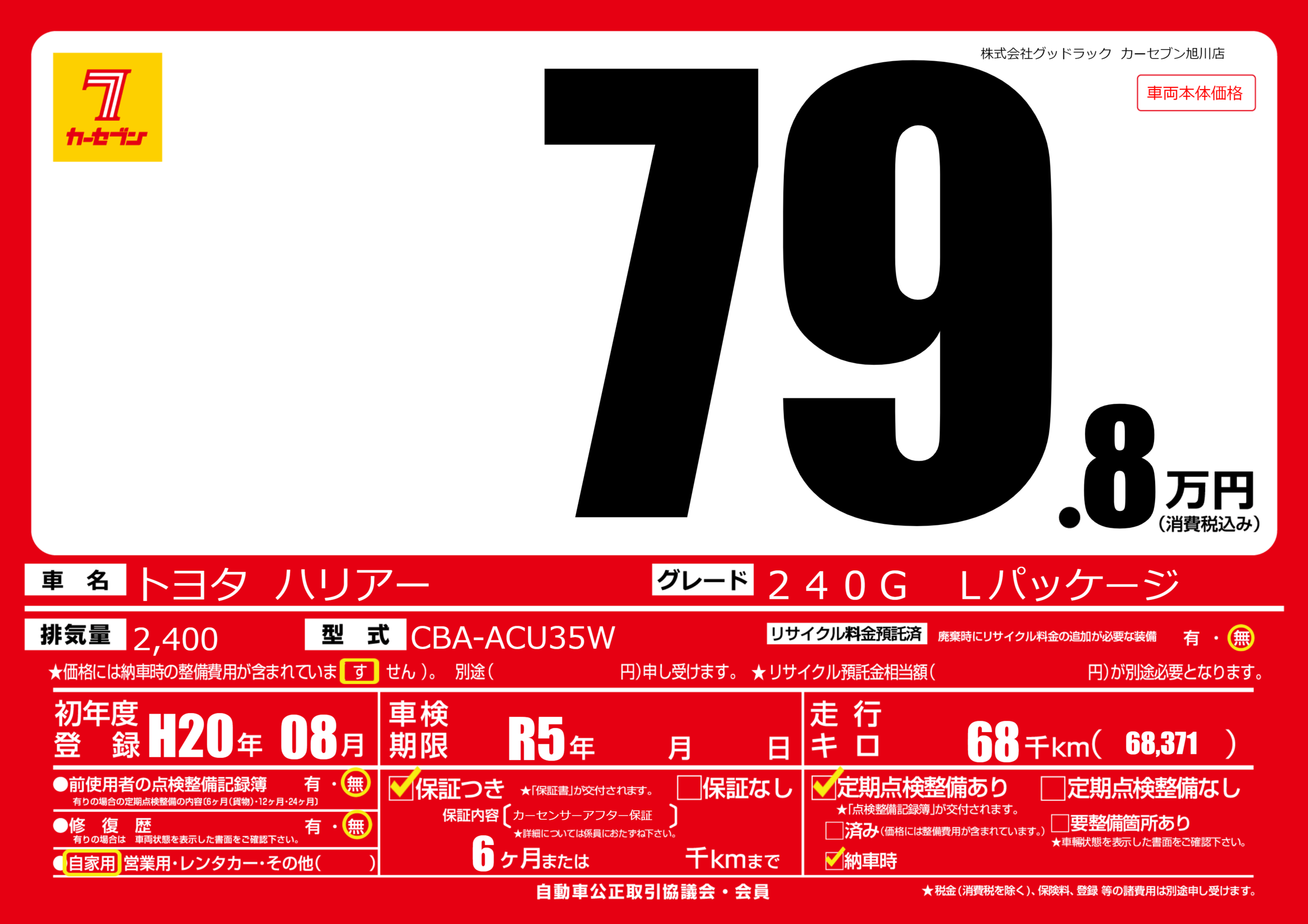 | 走行キロ | 6.8万km | 初年度登録 | H20年08月 |