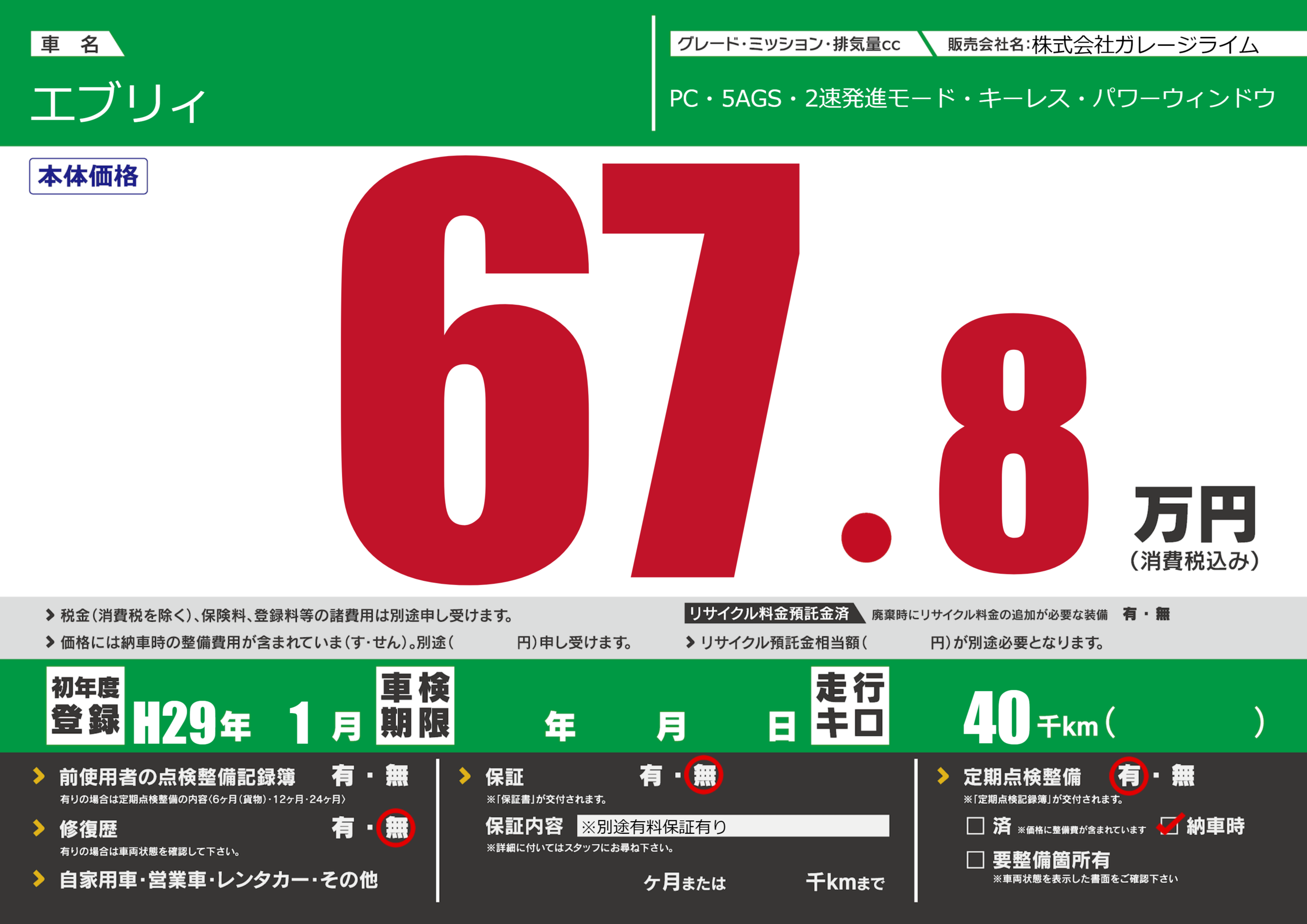 | 車名 | エブリィ | グレード ミッション 排気量 |