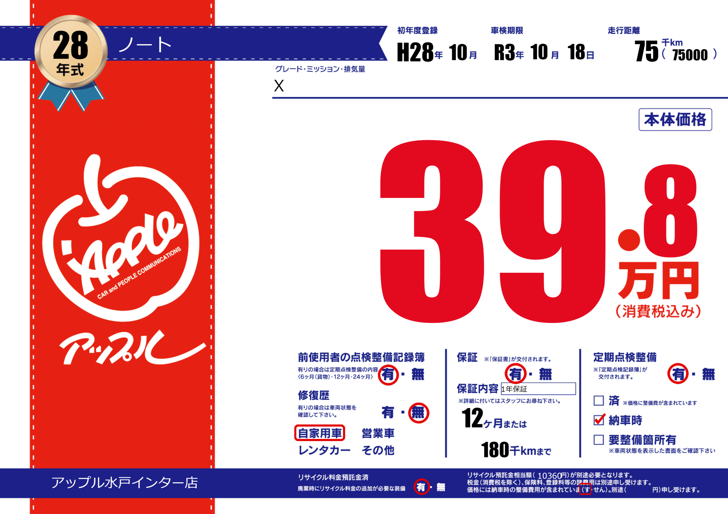 保証付き 保証内容(1年保証) 12ヶ月または(180)千kmまで |