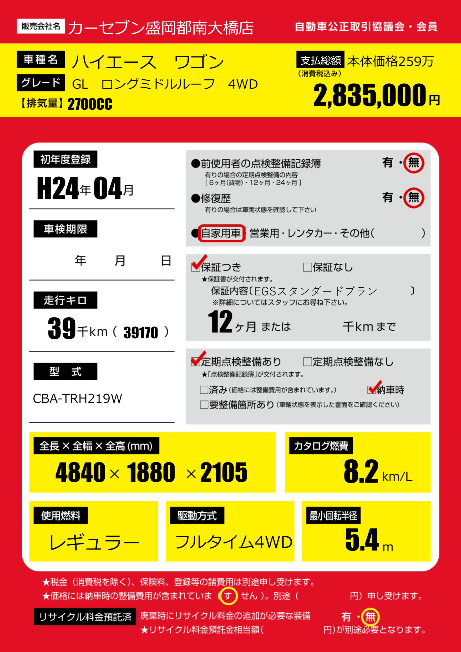| 車名 | ハイエース ワゴン | グレード ミッション 排気量 |