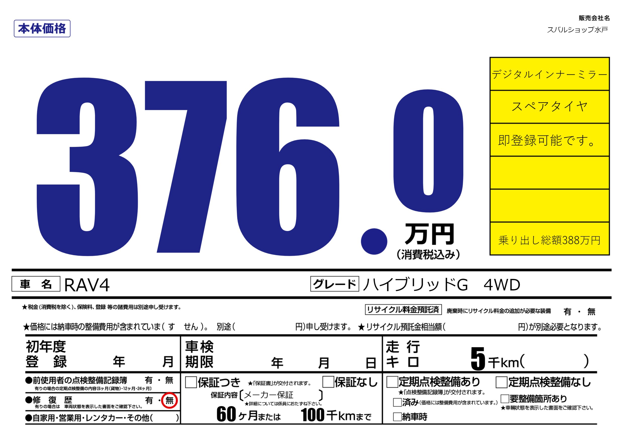 | 車名 | RAV4 | グレード ミッション 排気量 |