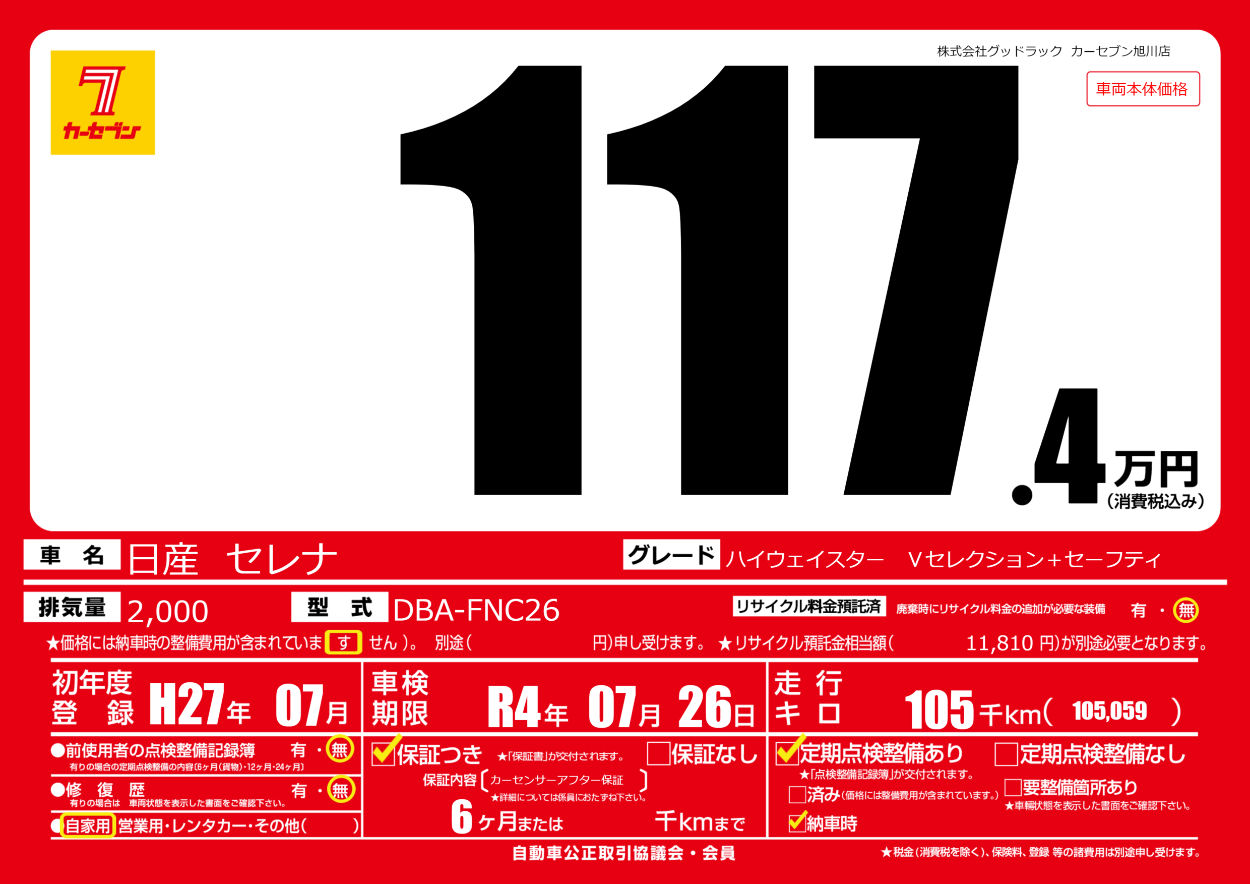 | 車名 | 日産 セレナ | グレード ミッション 排気量 |
