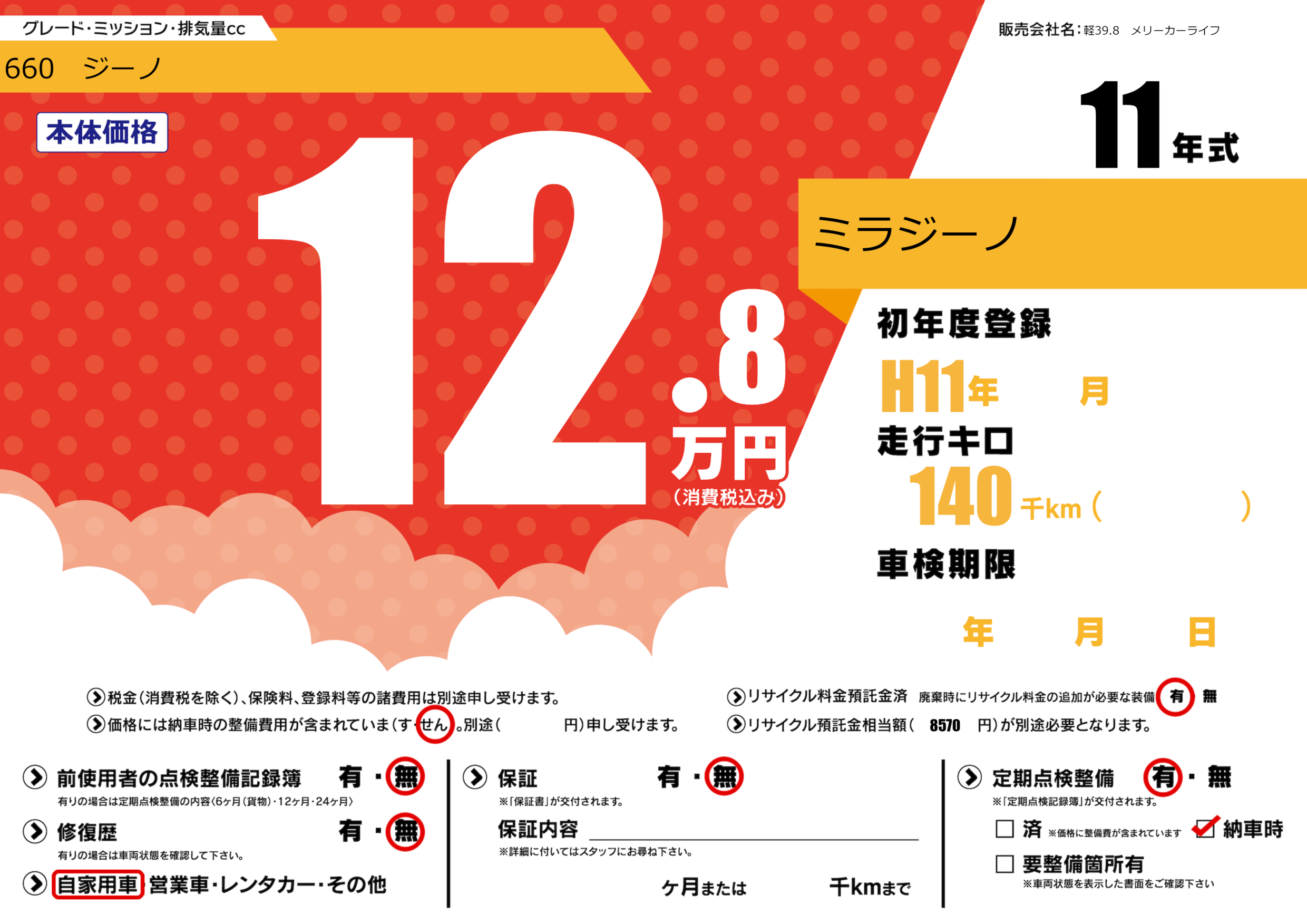 | 走行キロ | 14万km | 初年度登録 | H11年---月 |