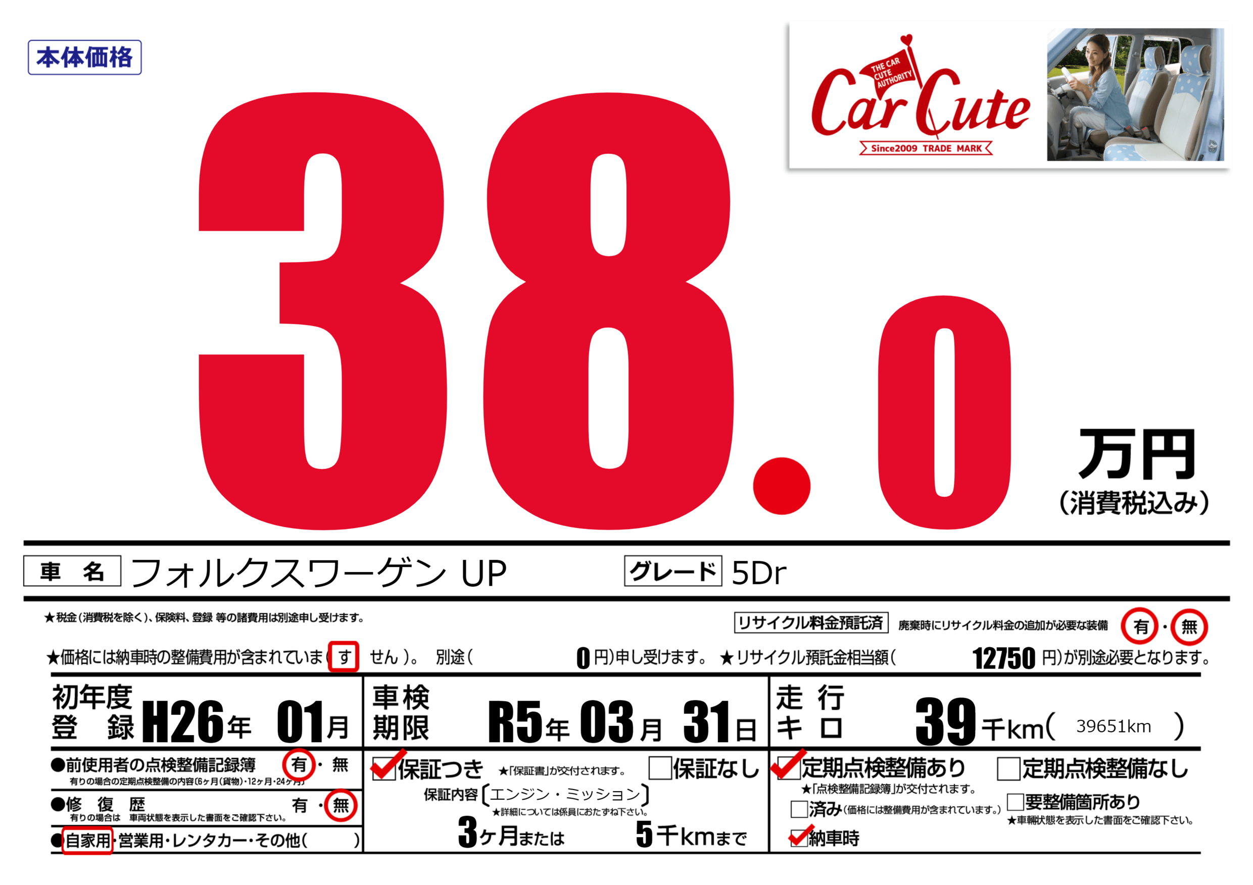 | 車名 | フォルクスワーゲン UP | グレード ミッション 排気量 |